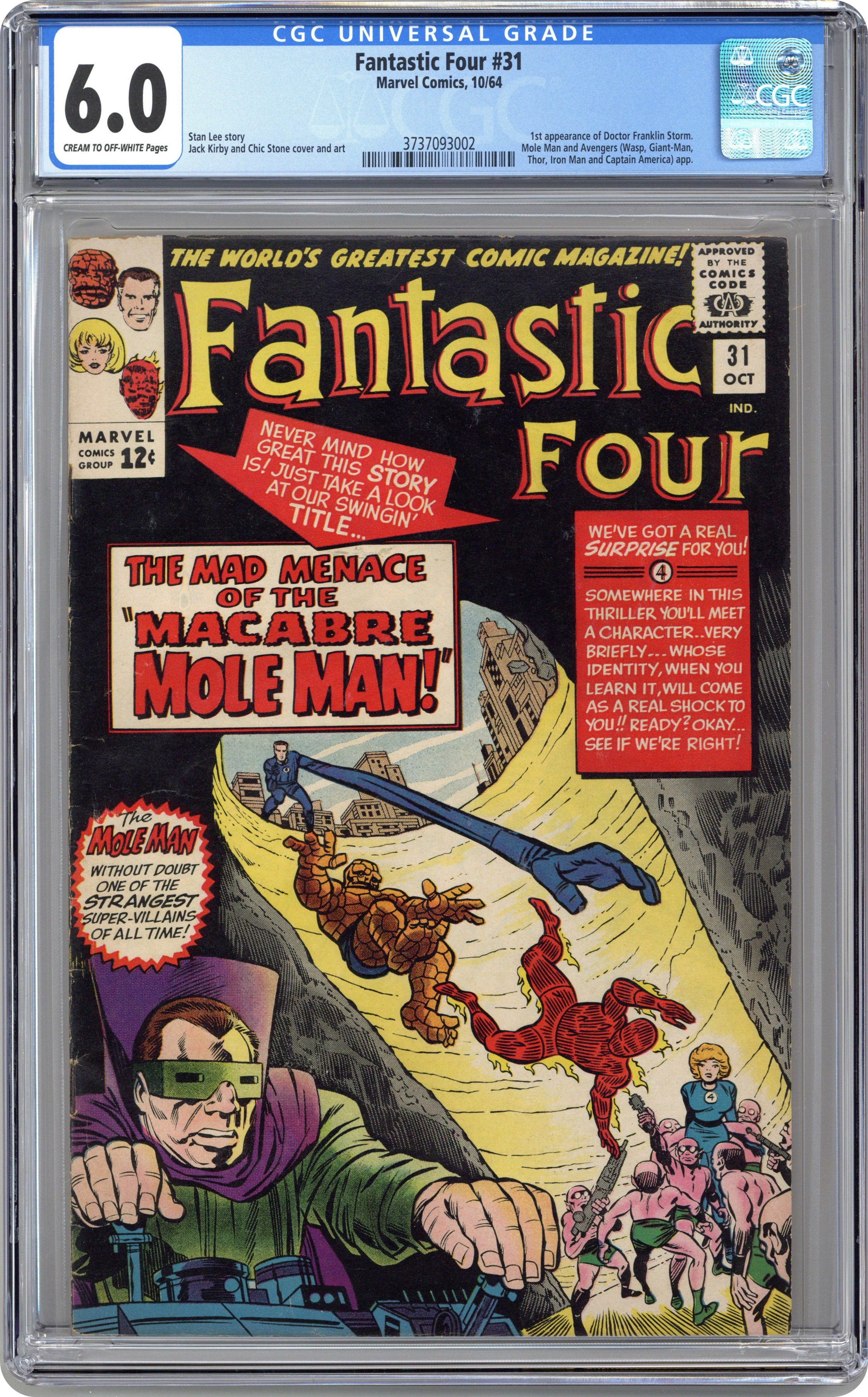 Ended May 12 2021 Winning Bid $110 Cover pencils by Jack Kirby, inks by Chic Stone. The Mad Menace of the Macabre Mole Man!, script by Stan Lee, pencils by Jack Kirby, inks by Chic Stone; Mole Man lowers blocks of New York City into his realm; Sue is injured in the ensuing battle and can only be saved by a surgery performed by her escaped felon father. 36 pgs. $0.12. Cover price $0.12. Grade: CGC 6.0 explanation of grade Condition: Used (collectible)