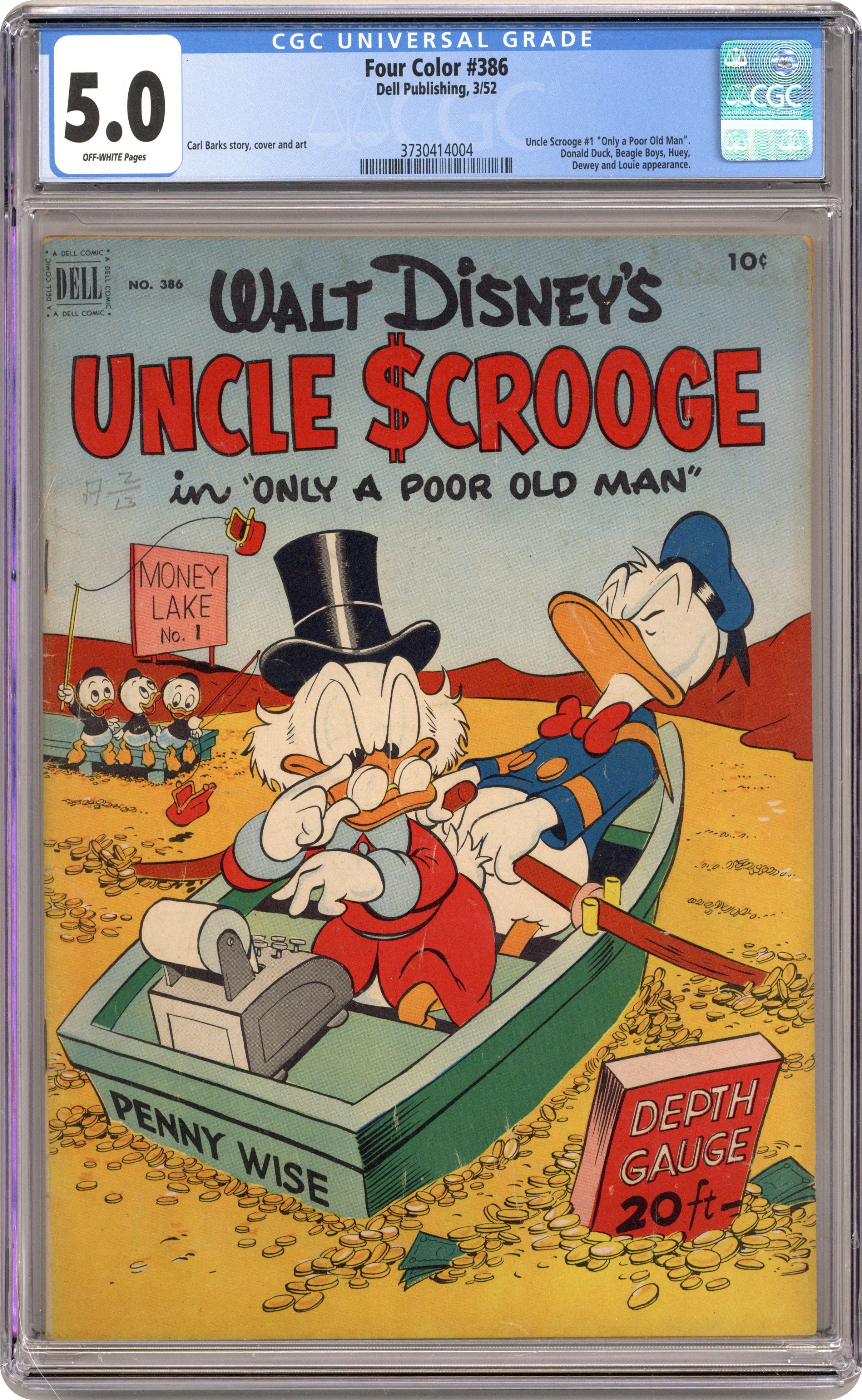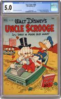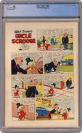 Ended Apr 13 2021 Winning Bid $430 Cover art by Carl Barks. Only a Poor Old Man; When the Beagle Boys erect a building next to Scrooge's money bin, with plans to puncture the bin and drain out the money, Scrooge secretly transfers his money to an old reservoir, where he hides it underwater; Learning of this stratagem, the Beagle Boys try to destroy a dam so that Scrooge's money will flow onto their land. Coffee for Two; Scrooge takes a bum to a diner for a "free" cup of coffee. Soupline Eight back cover strip; Scrooge decides to "take a chance" on the Soupline Eight car. Scripts and art by Carl Barks. 36 pages, full color. Cover price $0.10. Grade: CGC 5.0 explanation of grade Condition: Used (collectible)