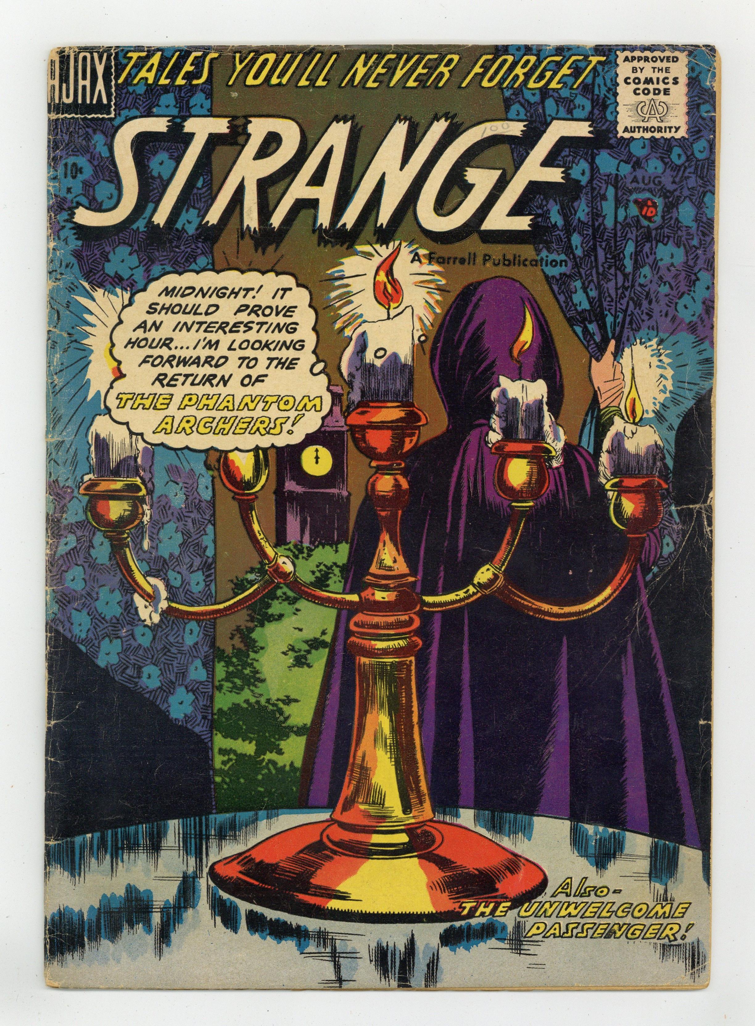 Tales of the supernatural from the early days of the Comics Code, with art by the Iger Shop. The strange tale of a super-intelligent gorilla is narrated by the gorilla himself. German soldiers are routed by ghostly archers while in combat with British troops during World War I. Sailors stranded in the Sargasso Sea are aided by an albatross. The Portrait of Greed!; Creeping Vines; Trapped, But Not Forever!; The Phantom Archers; The Unwelcome Passenger! 36 pages, Full Color. Cover price $0.10. Grade: VG- 3.5 explanation of grade Condition: Used (collectible)
