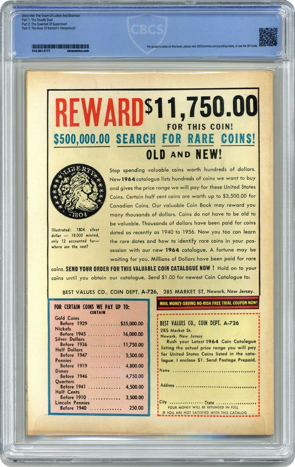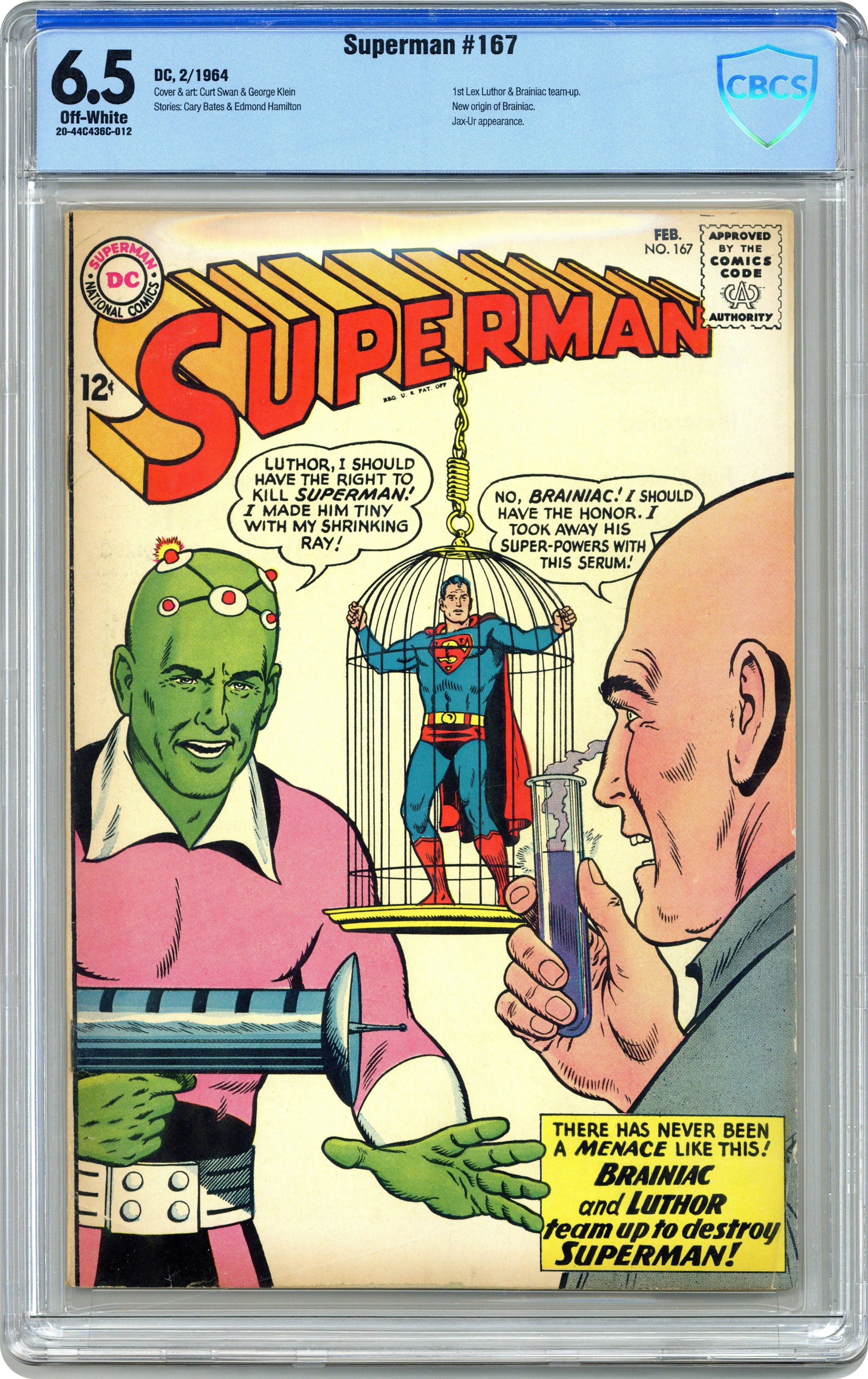Cover pencils by Curt Swan, inks by George Klein. The Deadly Duo! [The Team of Luthor and Brainiac! part 1], script by Edmond Hamilton and Cary Bates (plot), pencils by Curt Swan, inks by George Klein; Lex Luthor escapes prison and discovers the existence of Brainiac. The Downfall of Superman! [The Team of Luthor and Brainiac! part 2]; Lex Luthor releases Brainiac from prison, re-programs him, and teams with him to shrink Superman; 1st appearance of Tharla, Lex Luthor's future wife. The Hour of Kandor's Vengeance! [The Team of Luthor and Brainiac! part 3]; With the help of the Kandorians, Superman turns the tables on Luthor and Brainiac. Letter to the editor from comics writer E. Nelson Bridwell. 36 Pages, Full Color. Cover price $0.12. Grade: CBCS 6.5 explanation of grade Condition: Used (collectible)