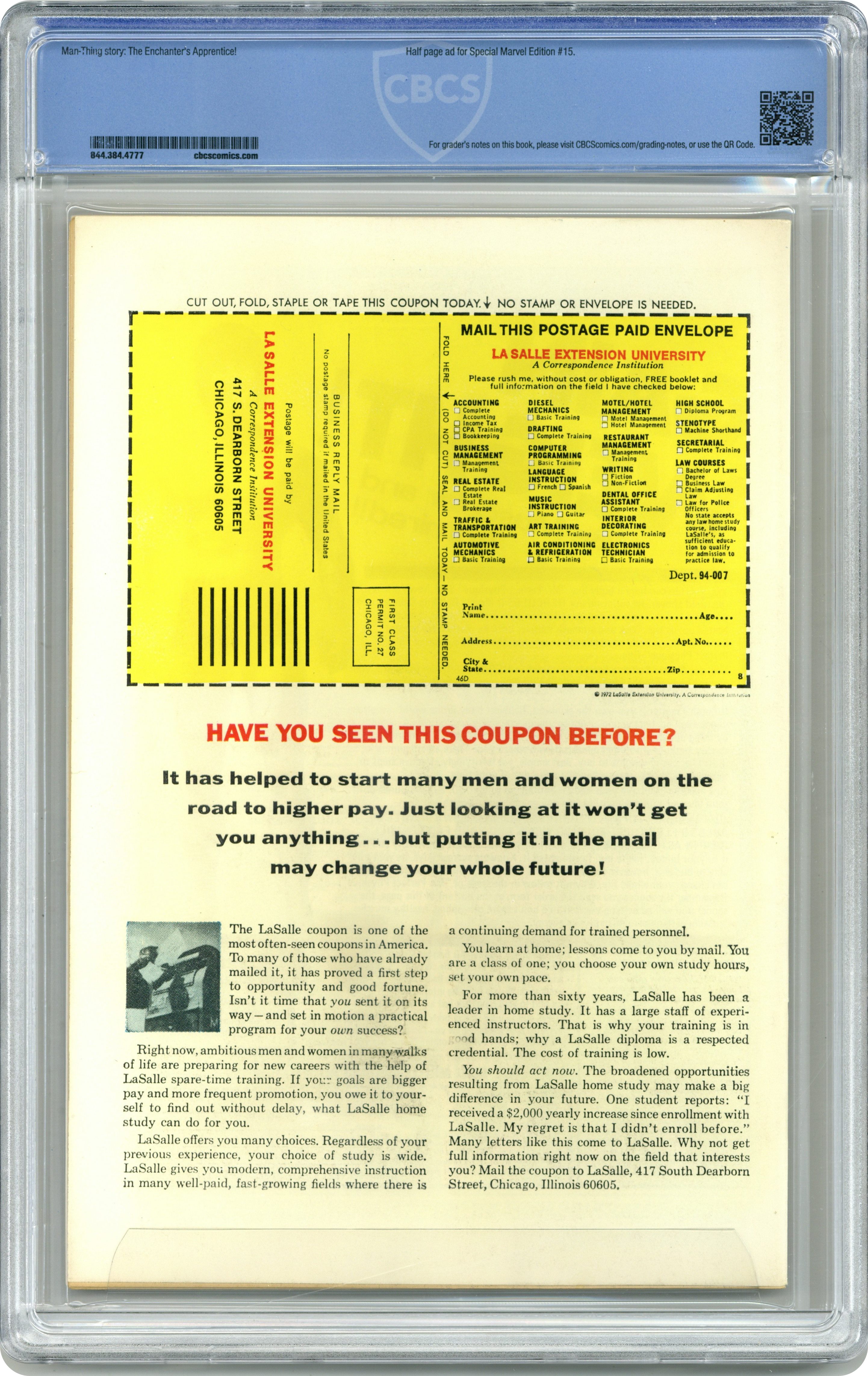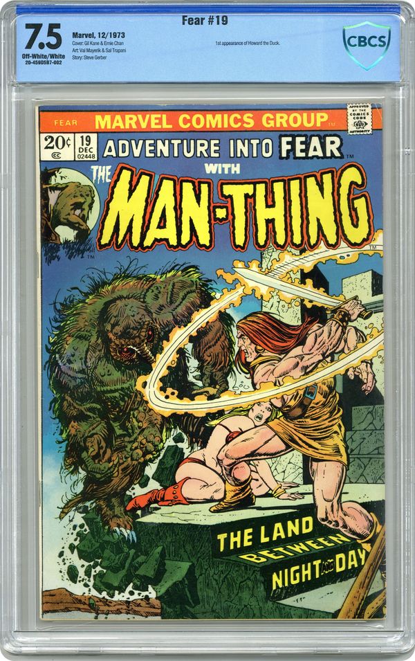 Ended Sep 20 2021 Winning Bid $286 1st appearance of Howard the Duck - Cover pencils by Gil Kane, inks by Ernie Chan. "The Enchanter's Apprentice!", script by Steve Gerber, pencils by Val Mayerik, inks by Sal Trapani; As an improbable battle rages on below the castle, Man-Thing is picked up by Jennifer Kale, with the savage Korrek following from behind; Korrek catches up with Kale and the Man-Thing and attacks the two of them; Jennifer suddenly awakens screaming, and as her brother and grandfather burst into the room to reassure her it's all a dream; However, Joshua Kale has his doubts that his granddaughters nightmares being just dreams; His suspicions are validated when Korrek is transported to Earth's dimension through a jar of peanut butter and resumes his attack on Jennifer; However, when Joshua and Andy burst into the room, Korrek believes himself surrounded and flees into the swamp; The Kales are soon visited by Dahkim the Mystic who has come to tell the Kales about the disruption in the Nexus of Realities caused by the construction being done in the swamp; Korrek is visited by Howard the Duck, who has also found himself transported to Earth's dimension as well. Man-Thing stories continue in Man-Thing #1. 36 pgs., full color. Cover price $0.20. Grade: CBCS 7.5 explanation of grade Condition: Used (collectible)