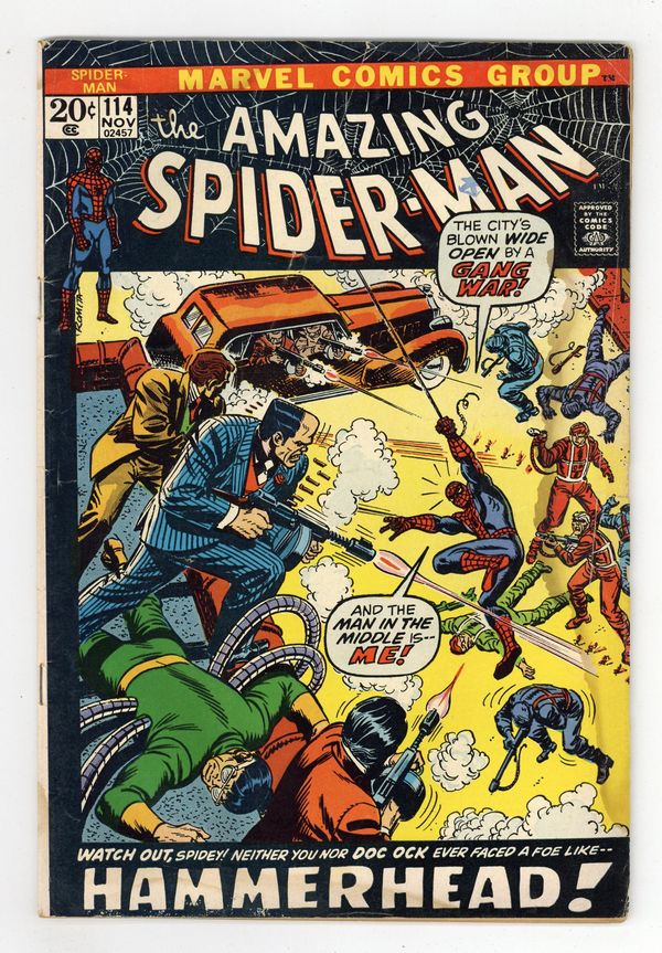 Mark Jeweler Advertisement Insert Variant. Doctor Octopus and Hammerhead continue to make Spidey's life as miserable as possible in "Who the Heck is Hammerhead?" Script by Gerry Conway, pencils by John Romita Sr., inks by Romita, Tony Mortellaro, and Jim Starlin. Romita cover. Cover price $0.20. Grade: GD- 1.8 explanation of grade Condition: Used (collectible)
