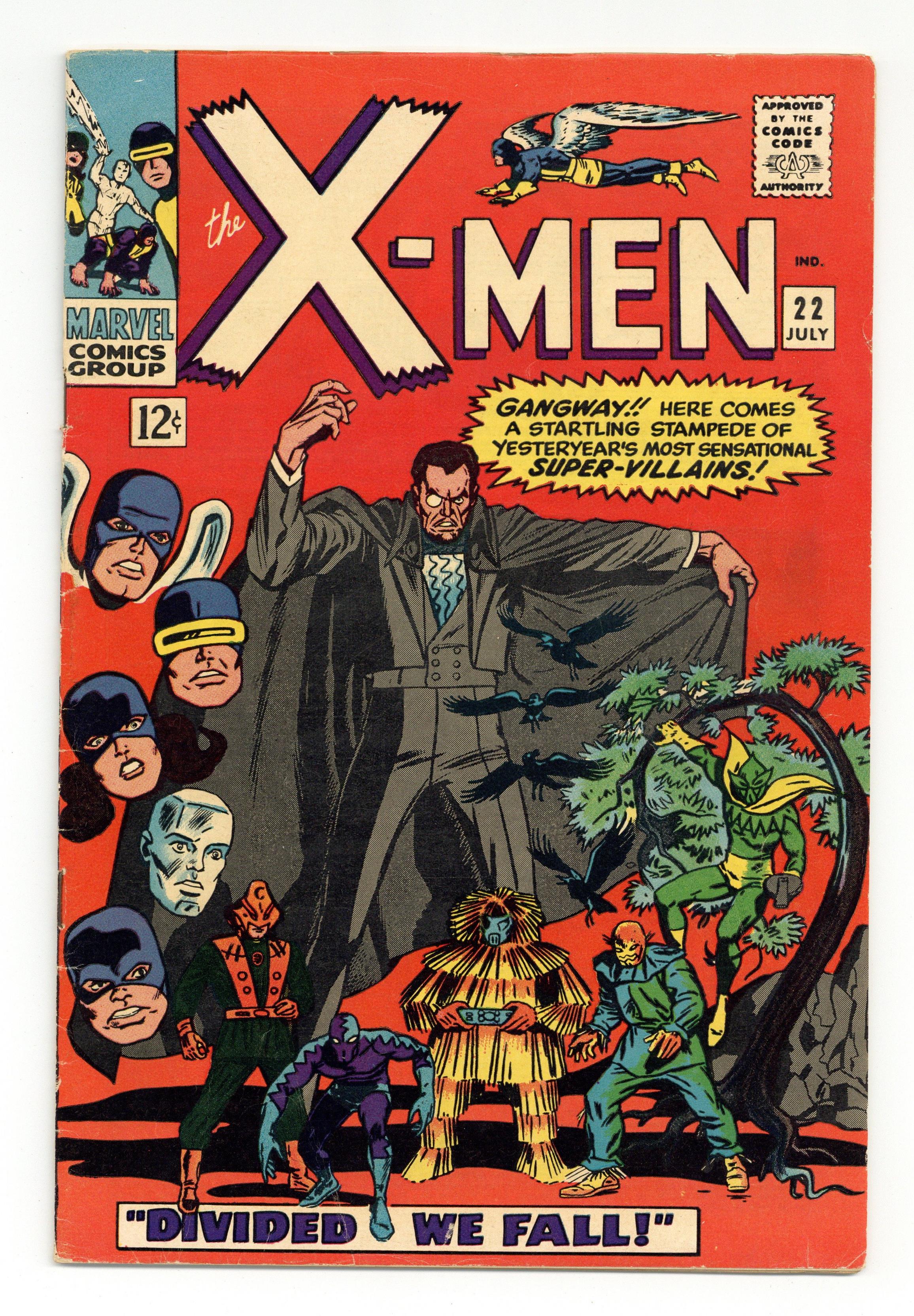 Count Nefaria, the Plantman, the Scarecrow, the Porcupine, the Eel, and the Unicorn appear. Cover pencils by Werner Roth, inks by Dick Ayers. Divided--We Fall!, script by Roy Thomas, pencils by Werner Roth (as Jay Gavin), inks by Dick Ayers; Trying once again to take a vacation, the X-Men are individually drawn to Central Park where they encounter phantom versions of themselves; One by one, they fall to five super powered villains; The X-Men are brought to Count Nefaria's fortress and he tries to convince them to join his plot to steal Washington D.C. and hold it for ransom. 36 pgs. $0.12. Cover price $0.12. Grade: VG/FN 5.0 explanation of grade Condition: Used (collectible)