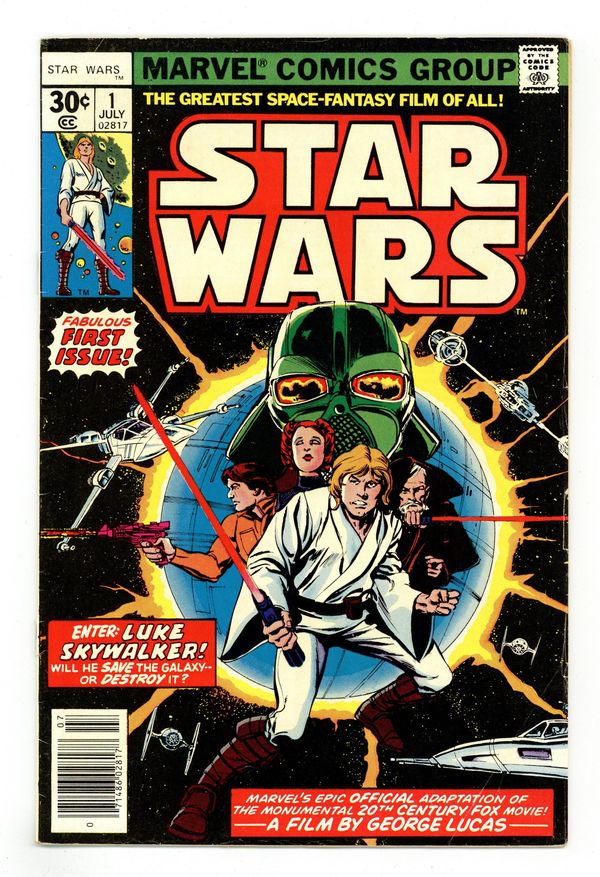 1st printing, standard 30 Cent Newsstand Edition with UPC. "A New Hope!" Part 1 of 6. Based on the screenplay by George Lucas. Adapted by Roy Thomas. Art by Howard Chaykin and Steve Leialoha.