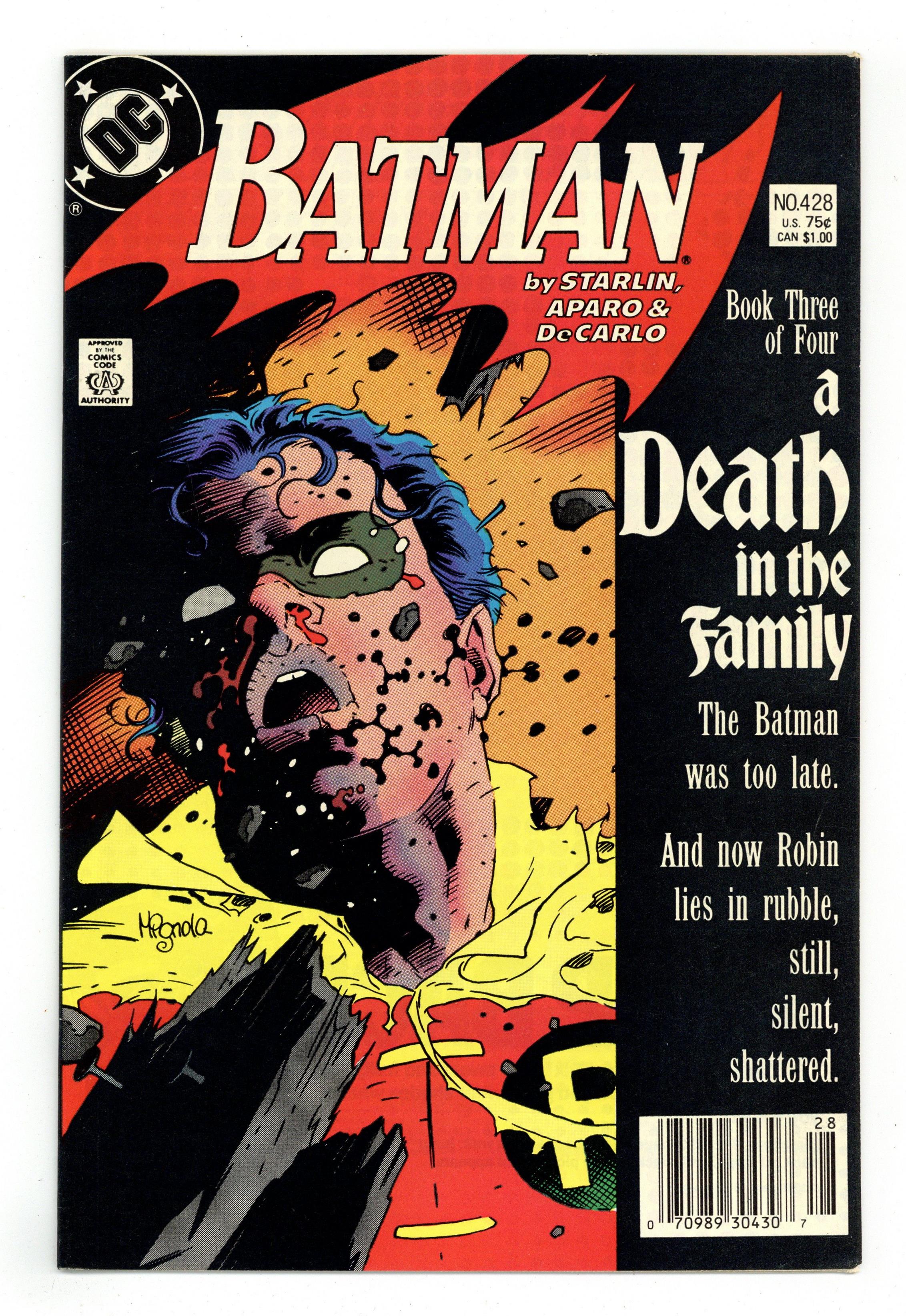 Ended Apr 30 2025 Winning Bid $22 First printing. Direct Edition. Cover art by Mike Mignola. "A Death in the Family" part 3 of 4, script by Jim Starlin, pencils by Jim Aparo, inks by Mike DeCarlo; Death of Sheila Haywood; Burial of Sheila Haywood and Jason Todd; The Joker becomes the Iranian Ambassador to the U.N. Results of Phone Poll as to whether Robin dies this issue or not. NOTE: Most issues from 397-432 were reprinted in 1989 and sold in multipacks. These 2nd and 3rd prints have back cover ads dated 1989. 36 Pages, Full Color. Cover price $0.75. Grade: FN/VF 7.0 explanation of grade Condition: Used (collectible)
