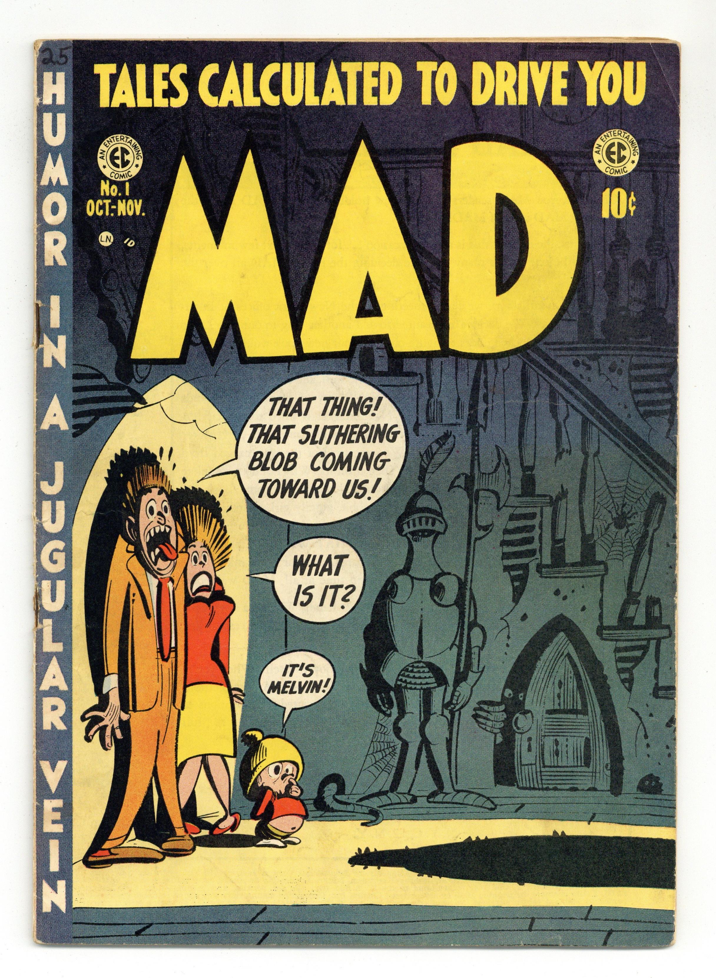 Ended Jul 13 2021 Winning Bid $861 Debut issue of the iconic publication Mad, which would change to magazine format with issue 24. Cover by Harvey Kurtzman. "Hoohah!", script by Harvey Kurtzman, art by Jack Davis; Two youngsters run out of gas and enter a house they think is haunted. "Blobs!", script by Harvey Kurtzman, art by Wally Wood; Alfred outlines a terrible thought he has about the end of humanity. "Enter Cosmo McMoon!" text story by Harvey Kurtzman. "Crow Vadis?" text story by Harvey Kurtzman. "Ganefs!", script by Harvey Kurtzman, art by Bill Elder; A perfect crime is hatched but Bumble fumbles. "Varmint!", script by Harvey Kurtzman, art by John Severin; Textron is hunting the killer of Melvin and kills every suspect. 36 pgs., full color. $0.10. Cover price $0.10. Grade: GD+ 2.5 explanation of grade Condition: Used (collectible)