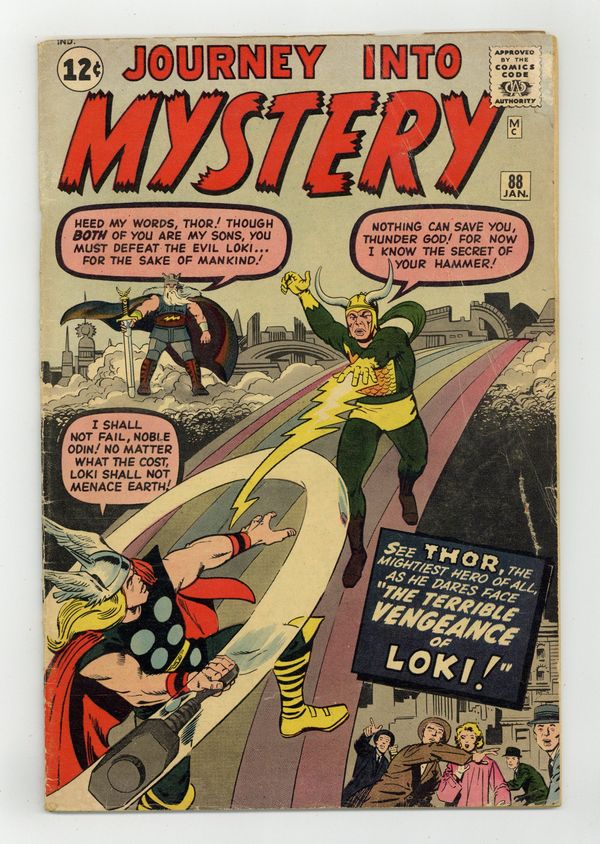 Cover pencils by Jack Kirby, inks by Steve Ditko. Loki returns in The Vengeance of Loki!", script by Stan Lee (plot) and Larry Lieber (script), pencils by Jack Kirby and Steve Ditko, inks by Dick Ayers and Steve Ditko; Loki discovers Thors secret identity and separates him from his hammer, forcing him to remain a human; Loki torments humanity, but Dr. Blake tricks him into allowing him to regain the hammer and become Thor, defeating Loki and returning him to Asgard. Masquerade" text story. Behind Locked Doors!", script by Stan Lee, art by Steve Ditko; A Soviet spy attempts to get American factory workers to strike by acts of sabotage and by convincing them that working conditions are unsafe; He doesn't reckon with the machines, which are "Made in America," coming to life with a mind of their own and taking matters in their own hands in order to deal with him. Long Live the Queen!", art by Don Heck; An impatient successor in ancient Egypt attempts to poison the queen, but is caught and sentenced to death; She bribes a sorceror to cast a spell to reincarnate her as a queen, and she is reborn as a queen bee. 36 pages, full color. Cover price $0.12. Grade: GD/VG 3.0 explanation of grade Condition: Used (collectible)