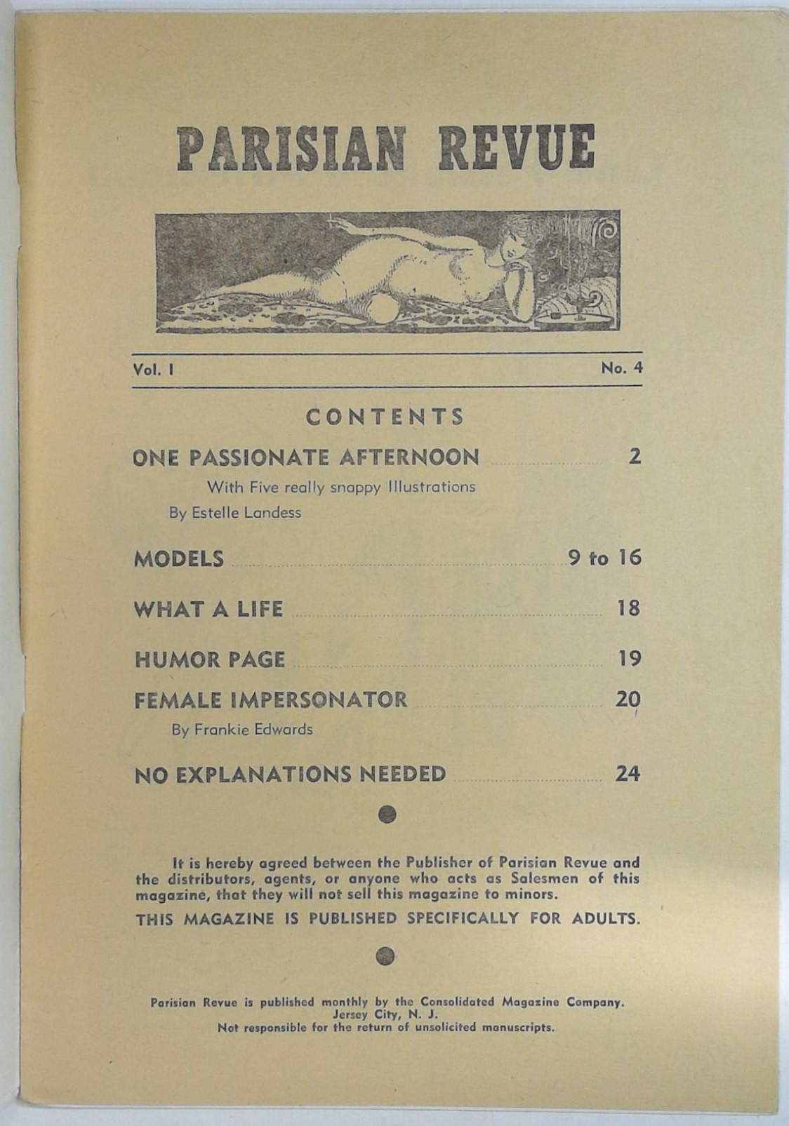 Vol. 1 #4, undated. Cover by George Quintana. Also used as the cover art for Paris Nights Vol. 14 #12. Illustrated short stories plus full-page pinups. 6 3/4-in. x 9 1/2-in., 24 pages, B&W. MATURE. Cover price $0.25. Grade: FN 6.0 explanation of grade Condition: Used (collectible)
