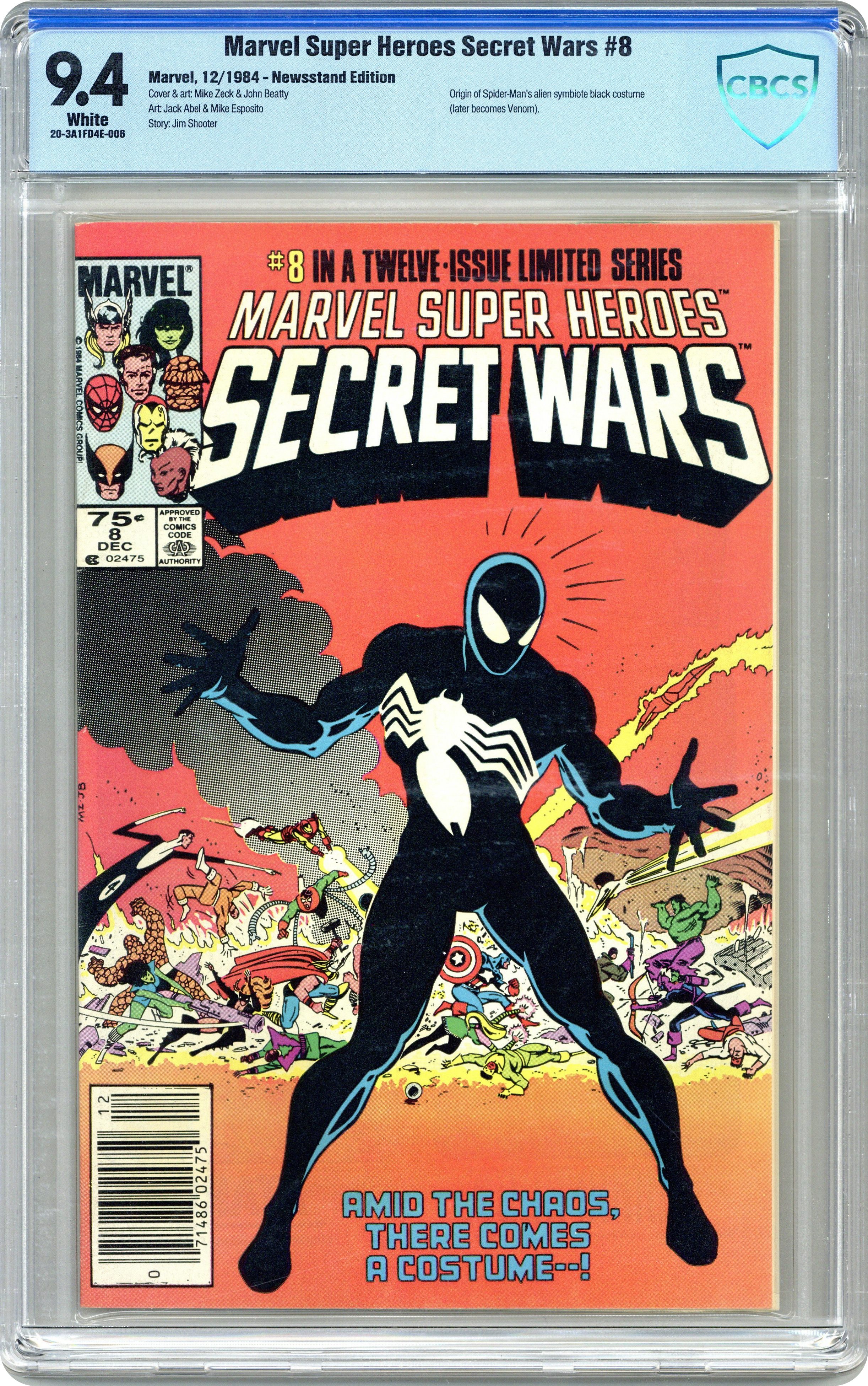 Ended Oct 16 2021 Winning Bid $205 Newsstand Edition. "Invasion!" Part 8 of 12. Story by Jim Shooter. Art by Mike Zeck, John Beatty, Jack Abel, and Mike Esposito. Tired of being the villains' punching bags, the heroes take the fight to their deadly foes' own doorstep. What follows is one of the most titanic super hero/villain tussles of all time. Plus, Spidey gets a new costume. 1st in continuity appearance of Spider-Man's black costume. See Amazing Spider-Man (Vol. 1) #252, Marvel Team-Up #141, & Spectacular Spider-Man #90 for the first appearances from 7 months earlier. NOTE: This costume turns out to be an alien symbiote that will later bond with Eddie Brock and become the tenacious Spidey villain known as Venom. See Amazing Spider-Man #300. 36 pages, full color. Cover price $0.75. Grade: CBCS 9.4 explanation of grade Condition: Used (collectible)
