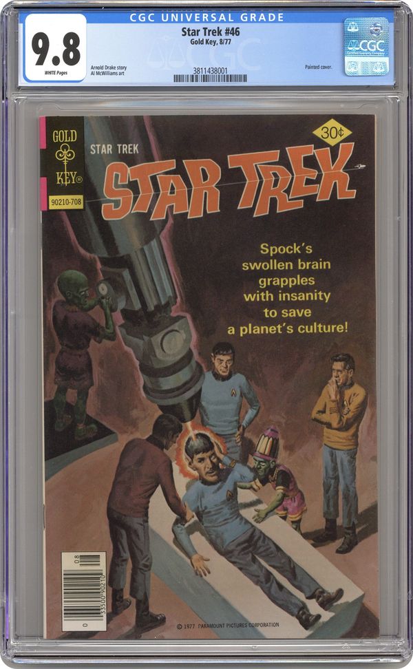 Comic book version of the original Star Trek TV series that starred William Shatner and Leonard Nimoy. 90210-708. Painted cover art. "Mr. Oracle," script by Arnold Drake, art by Alden McWilliams; Spock must become a living god, or an entire civilization will die! 36 pgs., full color. $0.30. Cover price $0.30. Grade: CGC 9.8 explanation of grade Condition: Used (collectible)