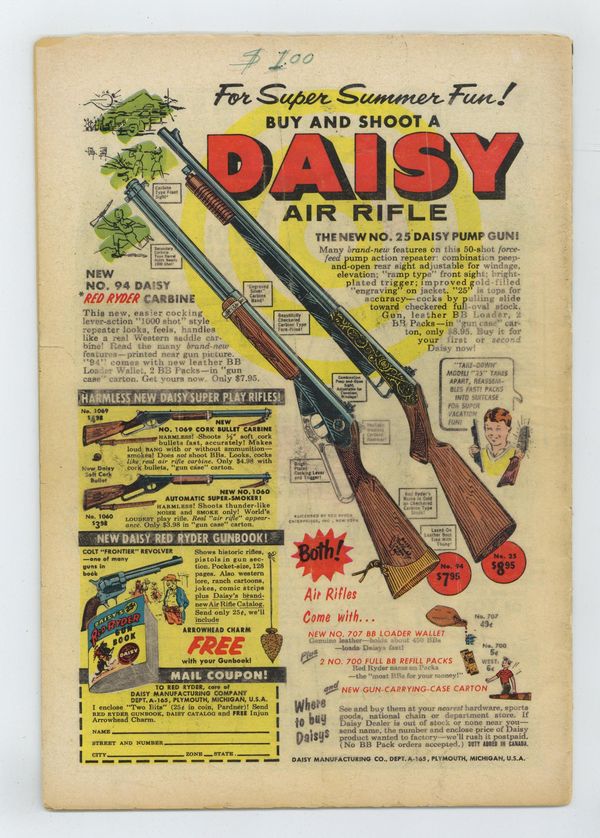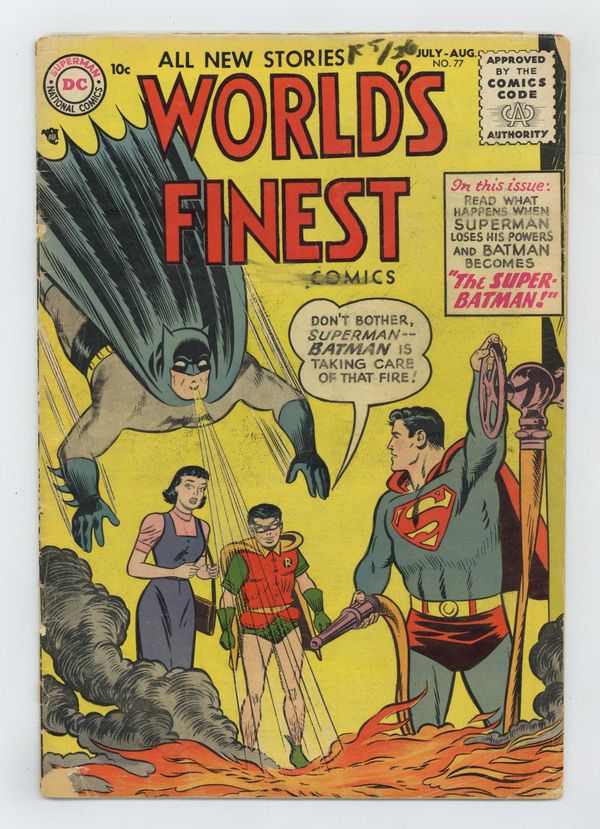 Cover pencils by Curt Swan, inks by Stan Kaye. The Super Bat-Man!, script by Edmond Hamilton, pencils by Curt Swan, inks by Stan Kaye; Superman and Batman are both on the trail of Prof. Pender, a criminal genius; But when they find him, Pender exposes Superman to a "decharging ray," which takes away his powers, and Batman accidentally steps in front of Pender's activated super-charging machine, giving him super-powers. Movie Ha-Lights humor page by Harry Lampert. Family Projects Can Be Fun public service announcement starring Binky, script by Jack Schiff, art by Win Mortimer. The Million-Dollar Arrow starring Green Arrow, art by George Papp. Shorty two-pager by Henry Boltinoff. See-Saw in the Sky text story, script by Jack Miller [as Jack Marks], art by Raymond Perry. Supergram the Superman Puzzle Game. The Juggler of Fort Cayuga starring Tomahawk, art by Fred Ray. House ad for The Adventures of Dean Martin and Jerry Lewis #22 and Leave It to Binky #48. 36 Pages, Full Color. Cover price $0.10. Grade: GD+ 2.5 explanation of grade Condition: Used (collectible)