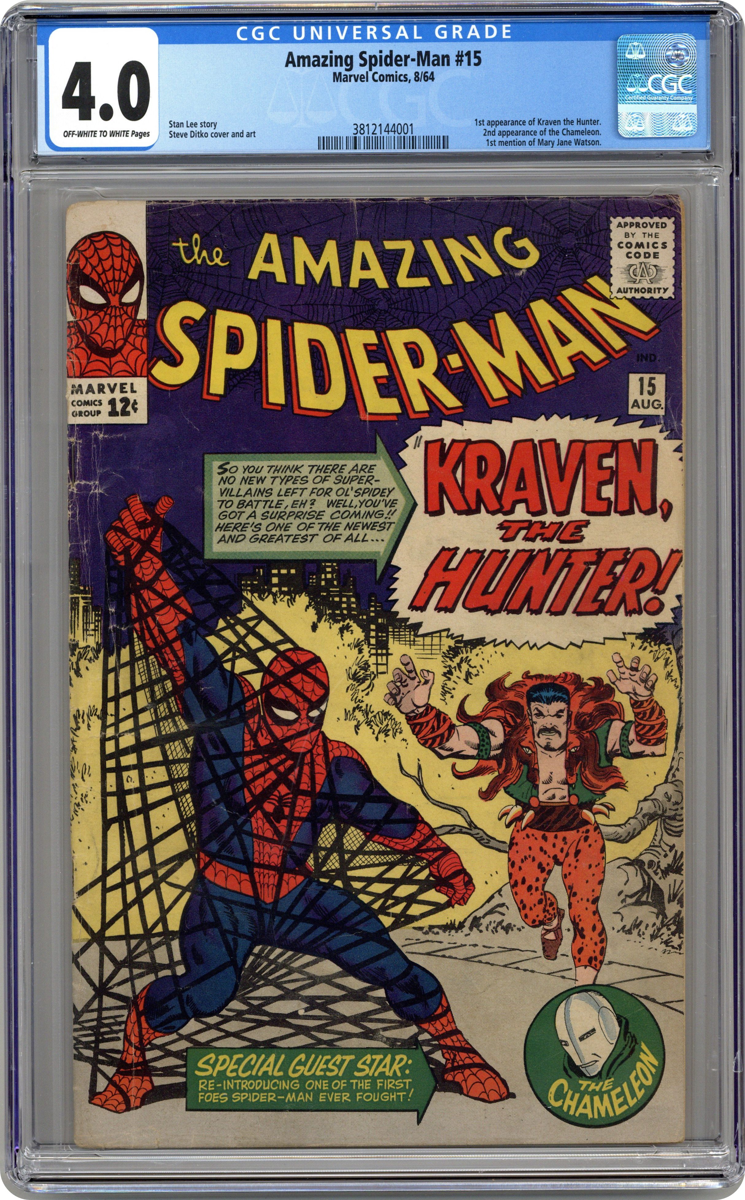 Ended Oct 26 2021 Winning Bid $1,705 Cover art by Steve Ditko. First appearance of Kraven the Hunter in Kraven the Hunter!, script by Stan Lee, art by Steve Ditko; The Chameleon hires his old friend Kraven the Hunter to hunt down Spider-Man. Reprinted in Marvel Tales # 10 and 153. 36 pgs. $0.12. Cover price $0.12. Grade: CGC 4.0 explanation of grade Condition: Used (collectible)