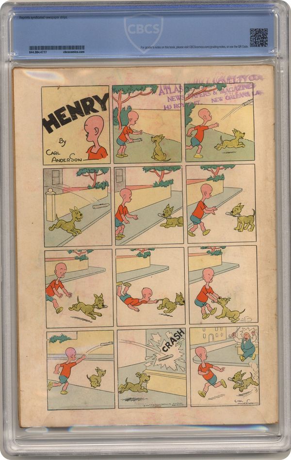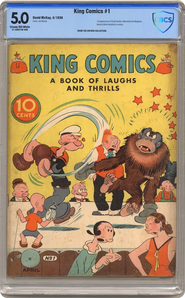 Ended Feb 1 2024 Winning Bid $10,350 Cover by Joe Musial. Edited by Ruth Plumly Thompson (sometimes credited as Jo King). Stories and art by William Ritt, Clarence Gray, Billy DeBeck, Brandon Walsh, Nicholas Afonsky, Carl Anderson, Jack Burnley, R. J. Scott, Eddie Sullivan, Charlie Schmidt, Lee Falk, Phil Davis, Lyman Young, Nat Edson, E. C. Segar, George Clarke, Lou Hanlon, George McManus, Otto Soglow, Eddie Rickenbacker, Clayton Knight, Ed Anthony, Romer Grey, Charles Flanders, Ruth Plumly Thompson, Don Moore and Alex Raymond. Pioneering comics publisher David McKay presents an anthology series featuring reprints of King Features Syndicate comic strips. Mandrake the Magician uses a flying carpet to free a rajah's daughter from an arranged marriage; Brick Bradford has adventures under the Earth's surface. Fun cover features multiple King Features characters interacting. Brick Bradford; Barney Google; Solve a Jiglette; Little Annie Rooney; Henry; Sport Features; Scott's Scrapbook; Radio Patrol; Mandrake the Magician; Tim Tyler's Luck; Thimble Theatre; Flash Gordon; The G-Man; Rosie's Beau; Bringing Up Father; The Little King; Ace Drummond; Ted Towers, Animal Master; King of the Royal Mounted; The Pet Post. 68 pages, Full Color. Cover price $0.10. Grade: CBCS 5.0 explanation of grade Condition: Used (collectible)