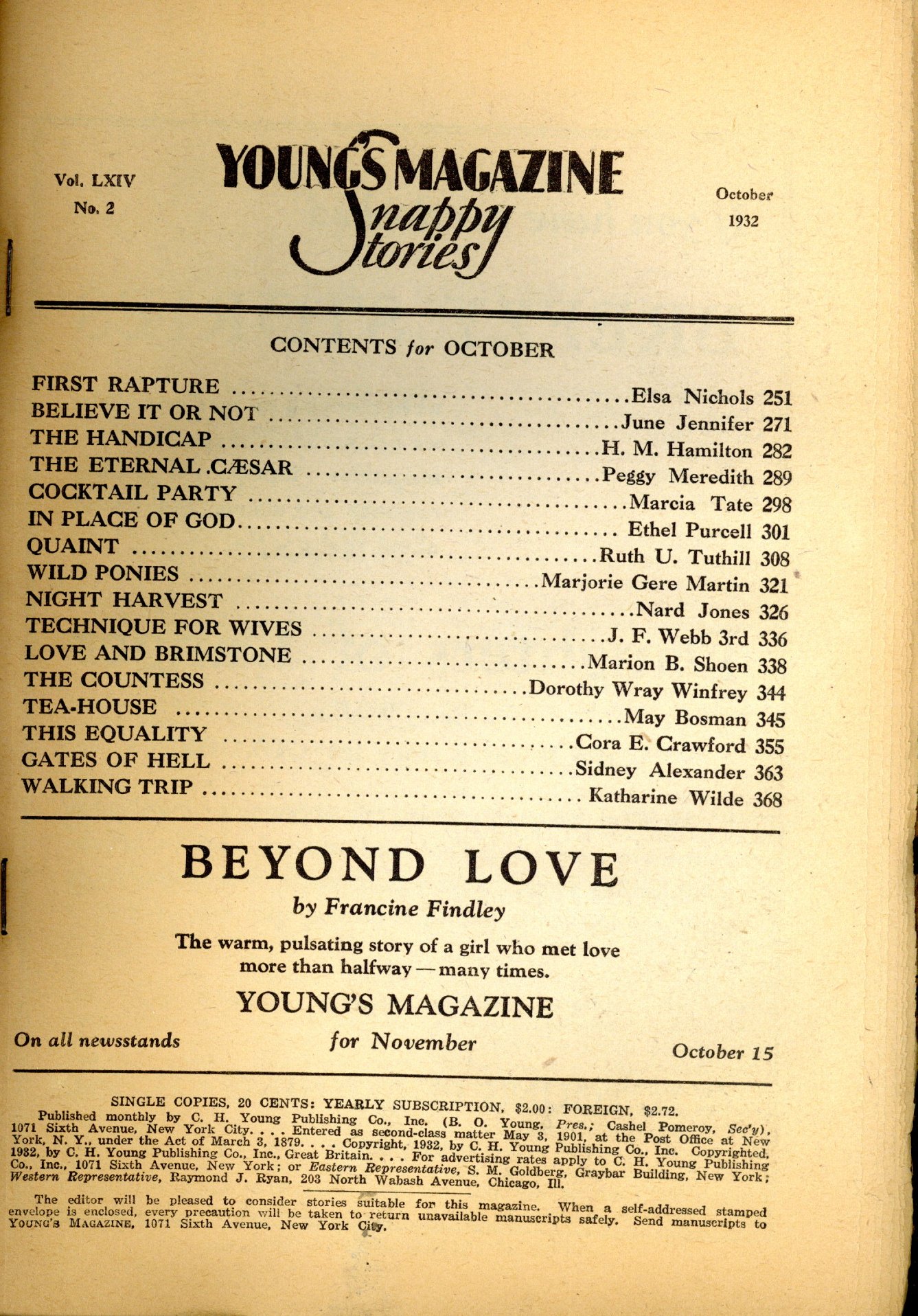 Vol. 64, No. 2. October 1932. Includes: "First Rapture" by Elsa Nichols; "Believe It or Not" by June Jennifer; "The Handicap" by H. M. Hamilton; "The Eternal Caesar" by Peggy Meredith; "Cocktail Party" by Marcia Tate; "In Place of God" by Ethel Purcell; "Quaint" by Ruth U. Tuthill; "Wild Ponies" by Margorie Gere Martin; "Night Harvest" by Nard Jones; "Technique for Wives" by J. F. Webb 3rd; "Love and Brimstone" by Marion B. Shoen; "The Countess" by Dorothy Wray Winfrey; "Tea-House" by May Bosman; "This Equality" Cora E. Crawford; "Gates of Hell" by Sidney Alexander; "Walking Trip" by Katharine Wilde. 6.75" x 10". 128 pages. Cover price $0.20. Grade: VG 4.0 explanation of grade Condition: Used (collectible)