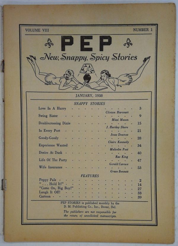 Vol. 8, No. 1. January 1938. Vintage men's interest magazine that features erotic fiction stories, as well as humorous poetry, adult comics and tasteful nude pin-up photographs. 7.5" x 10.5", 64 pages, B&W. -MATURE READERS- Cover price $0.25. Grade: GD/VG 3.0 explanation of grade Condition: Used (collectible)