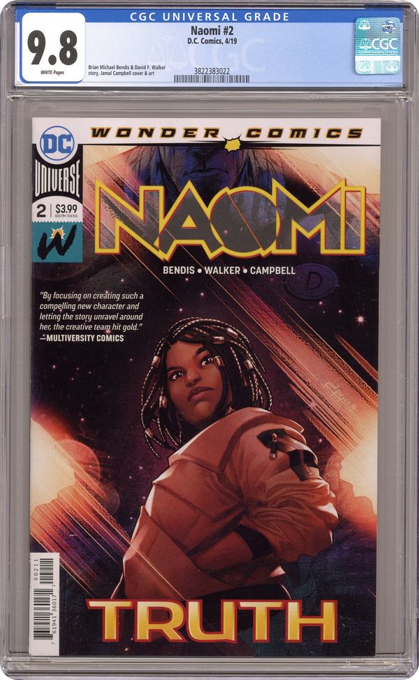 Ended Oct 27 2023 Winning Bid $26 Written by Brian Michael Bendis and David F. Walker. Art and Cover by Jamal Campbell. The most startling and intriguing mystery in the DC Universe continues as Naomi searches to uncover the secrets of her own origin. What do her small town's oversized mechanic and the last time a super-powered person appeared in her hometown have to do with the day she was adopted? Big emotions, new characters and a last page cliffhanger that can't be missed lead off this issue drawn by breakout sensation Jamal Campbell. Don't miss your chance to meet the most exciting new character in the DC Universe! 32 pages, full color. RATED T+ Cover price $3.99. Grade: CGC 9.8 explanation of grade Condition: Used (collectible)