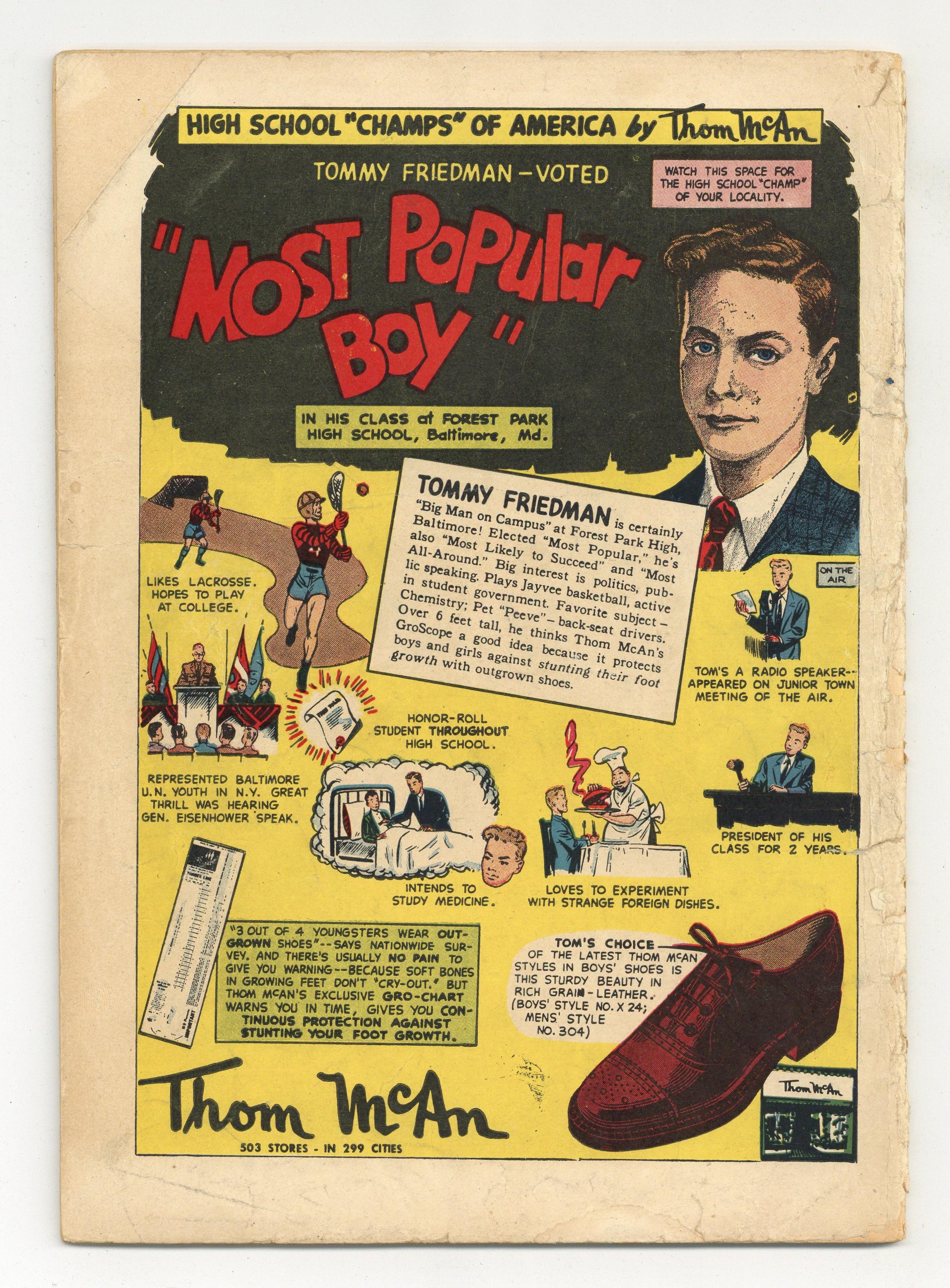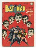 Cover pencils by Jim Mooney, inks by Charles Paris. "Gamble With Doom!", art by Jim Mooney (as Bob Kane); The Joker becomes passionate about gambling, but ordinary stakes won't satisfy him; The stakes with death to the loser involves Batman and Robin. "Born For Adventure!", script by Bill Finger, art by Jim Mooney; Batman and Robin team with an archeologist to track an international thief called the Globetrotter, who has come to Gotham City. "Strange Territory" text story by M. G. Pattington. "The First American Detective!", art by Jim Mooney; To solve the mystery surrounding his ancestor Silas Wayne, Bruce Wayne has Professor Nichols send him into the past; When Batman and Robin arrive in 1787, they stop a gang of highwaymen and encounter Franklin, who frees them. 52 Pages, Full Color. Cover price $0.10. Grade: GD 2.0 explanation of grade Condition: Used (collectible)