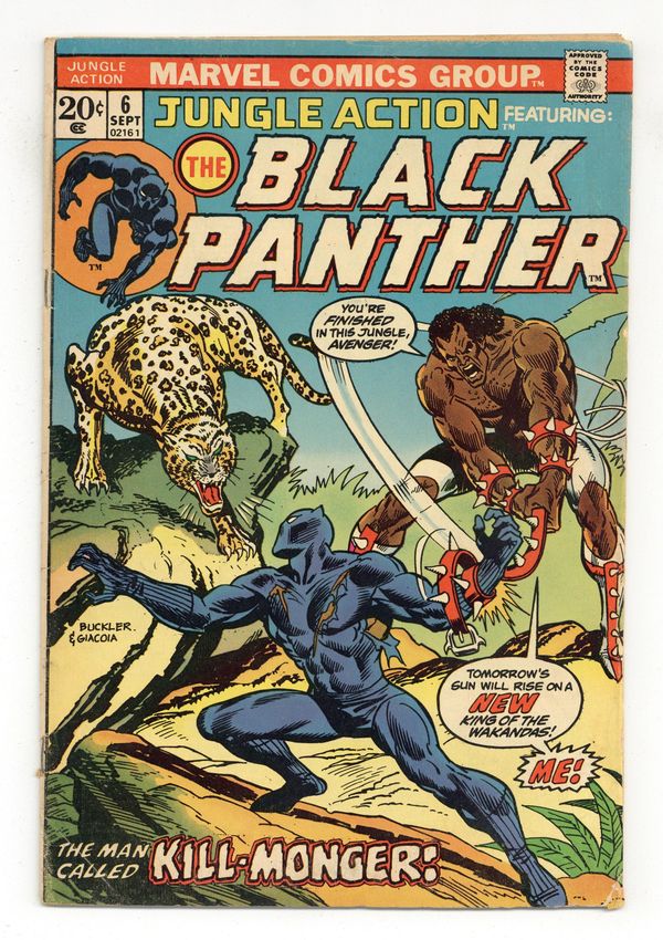 New Black Panther stories begin. Cover pencils by Rich Buckler, inks by Frank Giacoia. The "Panther's Rage" saga starts here in Panther's Rage, script by Don McGregor, pencils by Rich Buckler, inks by Klaus Janson; On his return to Wakanda, the Panther learns that one of the mountain villages is in revolt, led by a man calling himself Erik Killmonger (first appearance); The Panther confronts Killmonger at Warrior Falls, where the Panther is defeated and thrown from the top of the falls. Map of the Land of the Wakanda by Don McGregor. Double Danger! (reprinted from Lorna, the Jungle Girl 6, March 1954), script by Don Rico, art by Werner Roth; Lorna is impersonated by an imposter. Ad for FOOM! Friends of Ol' Marvel. 36 pgs., full color. Cover price $0.20. Grade: VG 4.0 explanation of grade Condition: Used (collectible)