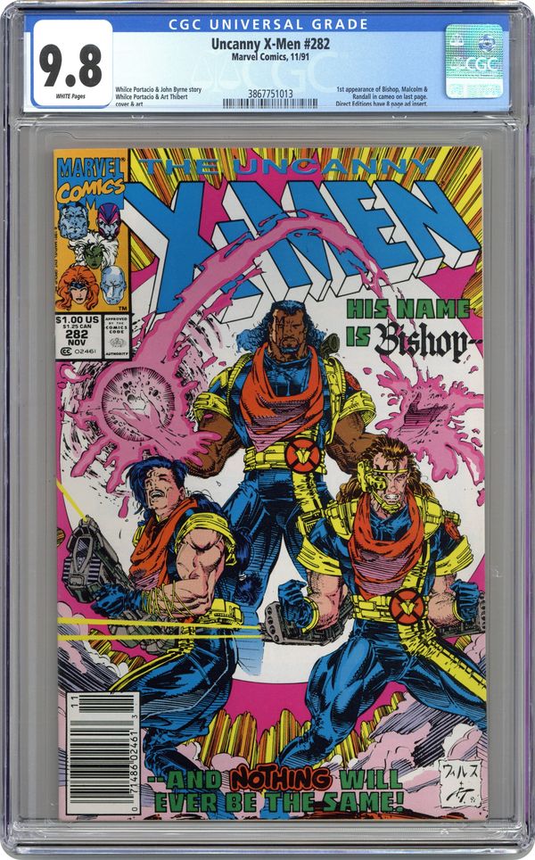 Ended Oct 9 2023 Winning Bid $295 Direct Edition. "Payback!" Story by Whilce Portacio and John Byrne. Art by Whilce Portacio and Art Thibert. In one fell swoop the Upstarts have destroyed the Reavers and crippled the Hellfire Club. Next up, the Mutant Liberation Front. Who can stop these powerful new foes? Enter: Bishop! NOTE: 1st appearance of Bishop. 40 pgs. Cover price $1.00. Grade: CGC 9.8 explanation of grade Condition: Used (collectible)
