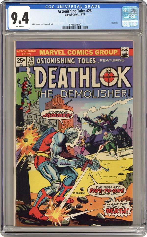 Cover art by Rich Buckler. Five To One, Deathlok...One In Five...No One Here Gets Out Alive!, script and art by Rich Buckler; Deathlok wanders off from his home with no particular plan except to find Major Simon Ryker and kill him; In the meantime Major Ryker sends his men and a super-tank powered by Nina's mind functioning in rapport with his omni-computer to intercept and kill him. Promo for the book The Origins of Marvel Comics. Ad for The Mighty Marvel Calendar for 1975! Marvel Value Stamp #84 featuring Dr. Doom. Promo for 3 Dimensional Marvel Superheroes Action Scenes featuring Spider-Man versus Kraven and Hulk versus Hydra. Stan Lee's Soapbox. Ad for Marvel Treasury Edition #2 starring the Fantastic Four, pencils by John Romita. 32 pgs. $0.25. Cover price $0.25. Grade: CGC 9.4 explanation of grade Condition: Used (collectible)