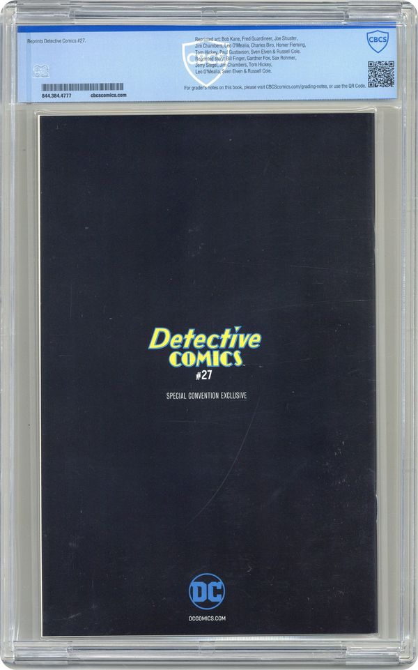 Ended Dec 19 2021 Winning Bid $46 Fan Expo 2017 exclusive cover by Jason Fabok. Reprints Detective Comics (1937 1st Series) #27. 1st appearance of Batman and Commissioner Gordon. The Case of the Chemical Syndicate starring The Bat-Man (as he's called in the story), script by Bill Finger, art by Bob Kane. The Killers of Kurdistan starring Speed Saunders, Ace Investigator, script by Gardner Fox, art by Fred Guardineer. Bullet Bluff starring Buck Marshall, Range Detective, art by Homer Fleming. Spy story, script by Jerry Siegel, art by Joe Shuster. The Crimson Avenger story, script and art by Jim Chambers. Death on the Airwaves text story by Gardner F. Fox (as Paul Dean), art by Fred Guardineer. Bruce Nelson story, script and art by Tom Hickey. The Mysterious Doctor Fu Manchu story, script and art by Leo O'Mealia. Cosmo, the Phantom of Disguise story, script and art by Sven Elven. Plain Clothes Pete story, script and art by Russell Cole (as Alger). Slam Bradley story, script by Jerry Siegel, art by Joe Shuster. Cover price $3.99. Grade: CBCS 9.8 explanation of grade Condition: Used (collectible)