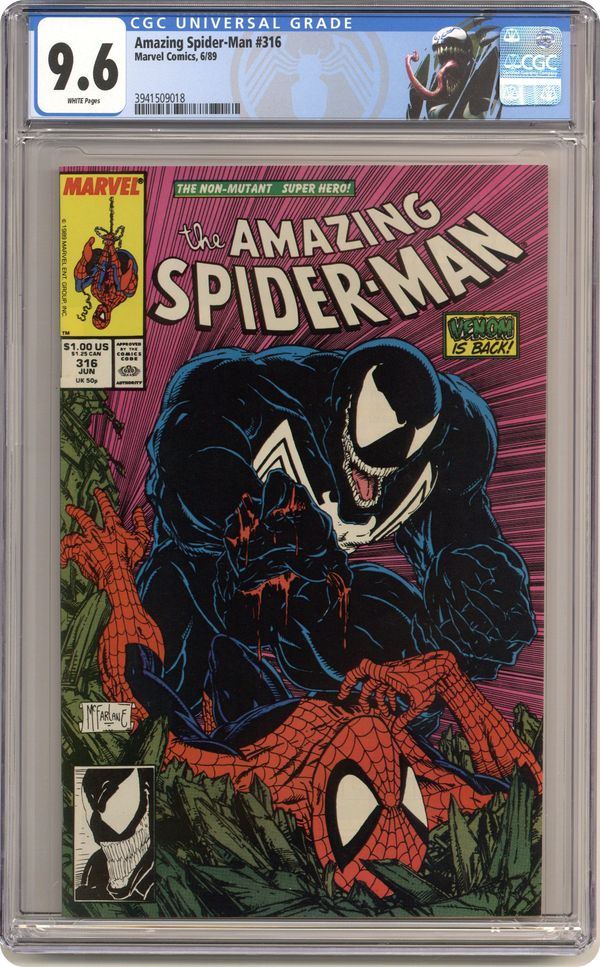 Direct Edition. "Dead Meat" Part 1 of 2. Script by David Michelinie. Art by Todd McFarlane. Cover by Todd McFarlane. Venom is back in New York City! And the deranged Eddie Brock is looking to kill Peter Parker or Spider-Man with extreme prejudice! However, first the psychotic symbiote has to find where the Parkers are living! At the web-slinger's former Bedford Towers residence, Venom runs into and then runs roughshod over the Black Cat! But Felicia doesn't know where the wall-crawler is either! Later on Peter learns that his worst nightmare has returned and his family is in grave danger. Spider-Man can't wait for Venom to make the first move. The web-slinger must attack! Cameo appearances by Aunt May, Glory Grant, and Eduardo Lobo. (Note: This two-part story was reprinted in 1990 in the trade paperback: Spider-Man vs. Venom.) 36 pages. Cover price $1.00. Grade: CGC 9.6 explanation of grade Condition: Used (collectible)