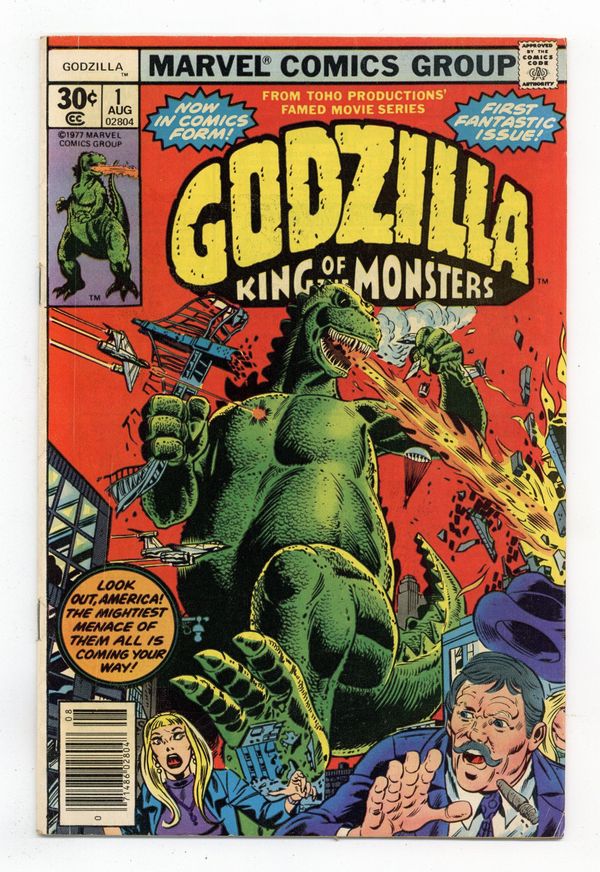 "The Coming!" Guest-starring Nick Fury and S.H.I.E.L.D. Story by Doug Moench. Art by Herb Trimpe and Jim Mooney. The slumbering leviathan known as Godzilla has awaken and rises out of the sea off the shores of Alaska. This reptilian titan has already left Japan devastated and now has made his way to America. With a tail that can smash mountains to dust and fiery breath born out of the Atomic Age, is there anything that can stop this monster's rampage? Right from the Toho Productions' famed movie series comes Godzilla, King of the Monsters. Cover price $0.30. Grade: VG 4.0 explanation of grade Condition: Used (collectible)