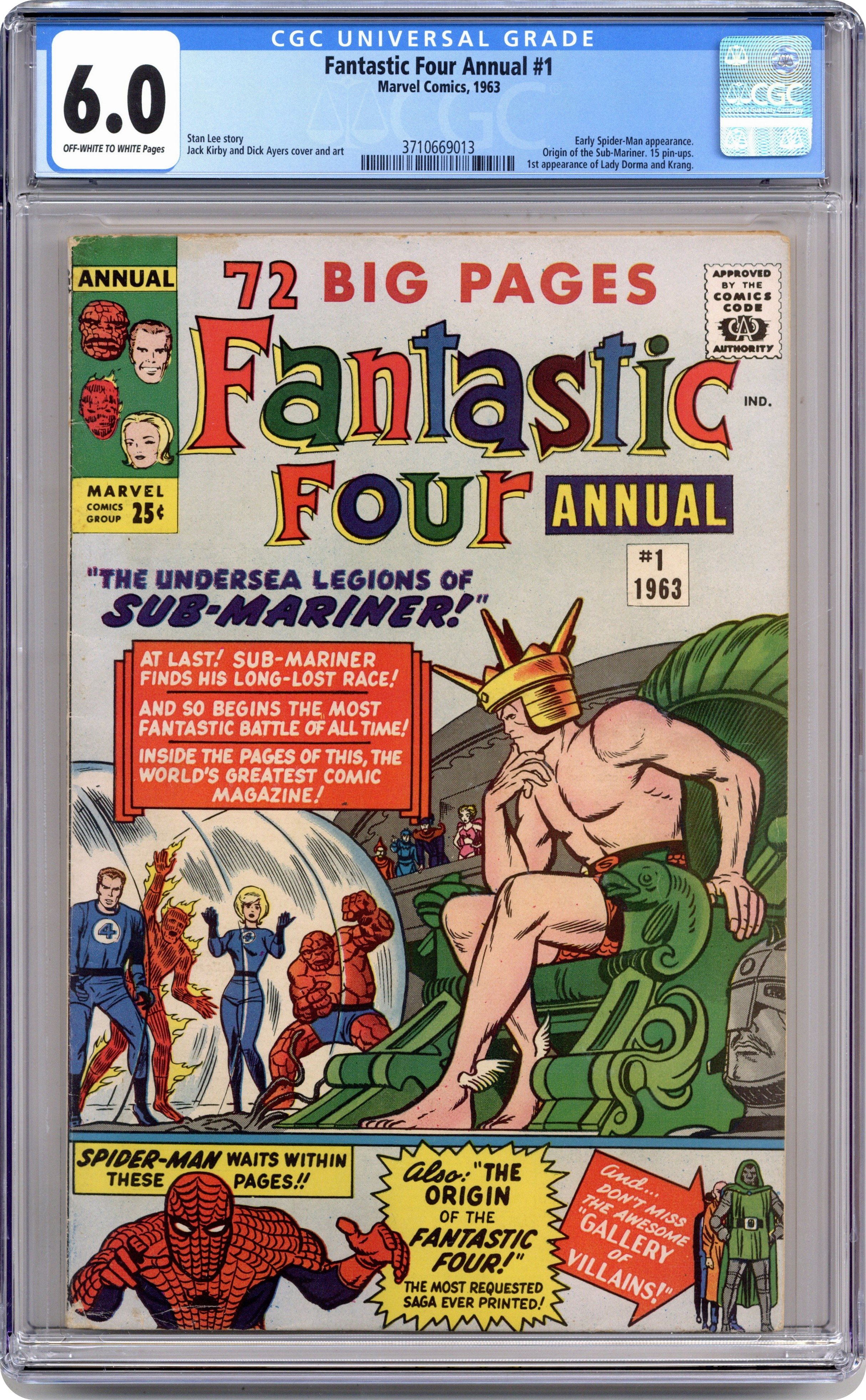Ended Apr 27 2023 Winning Bid $510 New Sub-Mariner/FF story: "Sub-Mariner Versus the Human Race!" Script by Stan Lee; pencils by Jack Kirby; inks by Dick Ayers. New Spider-Man/FF story: "The Fabulous Fantastic Four Meet Spider-Man!" Script by Stan Lee; pencils by Kirby; inks by Steve Ditko. Fourteen pages new pin-ups and special features by Kirby/Sol Brodsky. Thirteen-page Fantastic Four origin reprinted from FF #1 76 pgs. Cover price $0.25. Grade: CGC 6.0 explanation of grade Condition: Used (collectible)