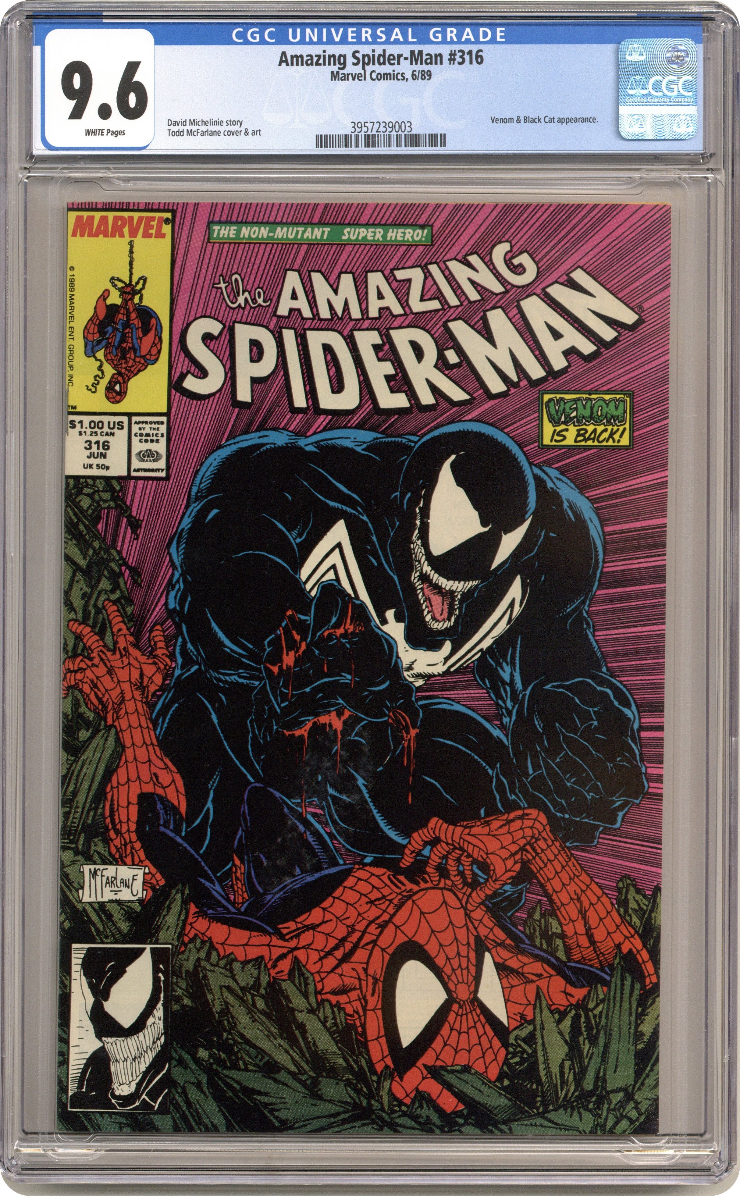 Ended Jan 14 2022 Winning Bid $321 Direct Edition. "Dead Meat" Part 1 of 2. Script by David Michelinie. Art by Todd McFarlane. Cover by Todd McFarlane. Venom is back in New York City! And the deranged Eddie Brock is looking to kill Peter Parker or Spider-Man with extreme prejudice! However, first the psychotic symbiote has to find where the Parkers are living! At the web-slinger's former Bedford Towers residence, Venom runs into and then runs roughshod over the Black Cat! But Felicia doesn't know where the wall-crawler is either! Later on Peter learns that his worst nightmare has returned and his family is in grave danger. Spider-Man can't wait for Venom to make the first move. The web-slinger must attack! Cameo appearances by Aunt May, Glory Grant, and Eduardo Lobo. (Note: This two-part story was reprinted in 1990 in the trade paperback: Spider-Man vs. Venom.) 36 pages. Cover price $1.00. Grade: CGC 9.6 explanation of grade Condition: Used (collectible)