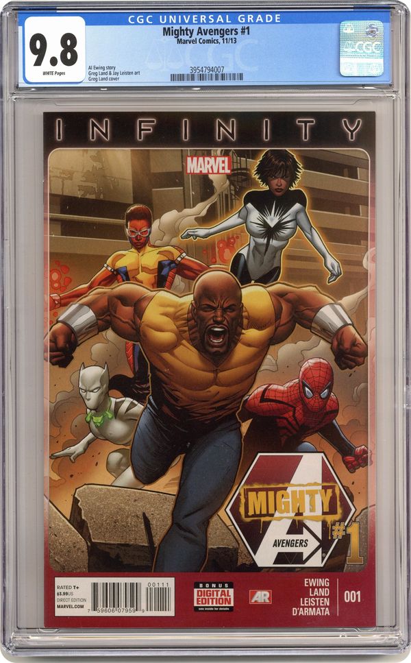 Ended Feb 27 2024 Winning Bid $23 Cover by Greg Land (W) Al Ewing (A) Greg Land INFINITY TIE-IN! new ongoing series! FROM THE BATTLEFIELDS OF INFINITY COMES THE MIGHTY AVENGERS! The Avengers are light-years away in space, contending with the Builders! Thanos' marauders ransack the Earth, doing as they please! Who will stand in defense of mankind? Luke Cage! The Superior Spider-Man! Spectrum! The White Tiger! Power Man! And a mysterious figure in an ill-fitting Spider-Man Halloween costume! These unlikely heroes must assemble when no one else can-against the unrelenting attack of Proxima Midnight! Cover price $3.99. Grade: CGC 9.8 explanation of grade Condition: Used (collectible)