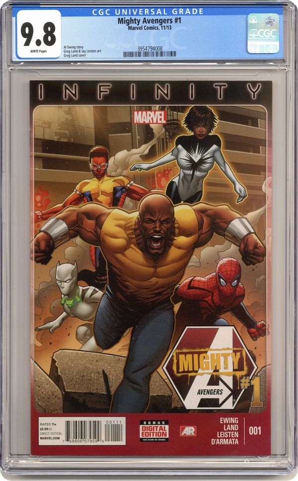 Ended Feb 27 2024 Winning Bid $24 Cover by Greg Land (W) Al Ewing (A) Greg Land INFINITY TIE-IN! new ongoing series! FROM THE BATTLEFIELDS OF INFINITY COMES THE MIGHTY AVENGERS! The Avengers are light-years away in space, contending with the Builders! Thanos' marauders ransack the Earth, doing as they please! Who will stand in defense of mankind? Luke Cage! The Superior Spider-Man! Spectrum! The White Tiger! Power Man! And a mysterious figure in an ill-fitting Spider-Man Halloween costume! These unlikely heroes must assemble when no one else can-against the unrelenting attack of Proxima Midnight! Cover price $3.99. Grade: CGC 9.8 explanation of grade Condition: Used (collectible)