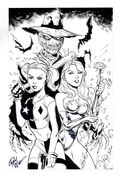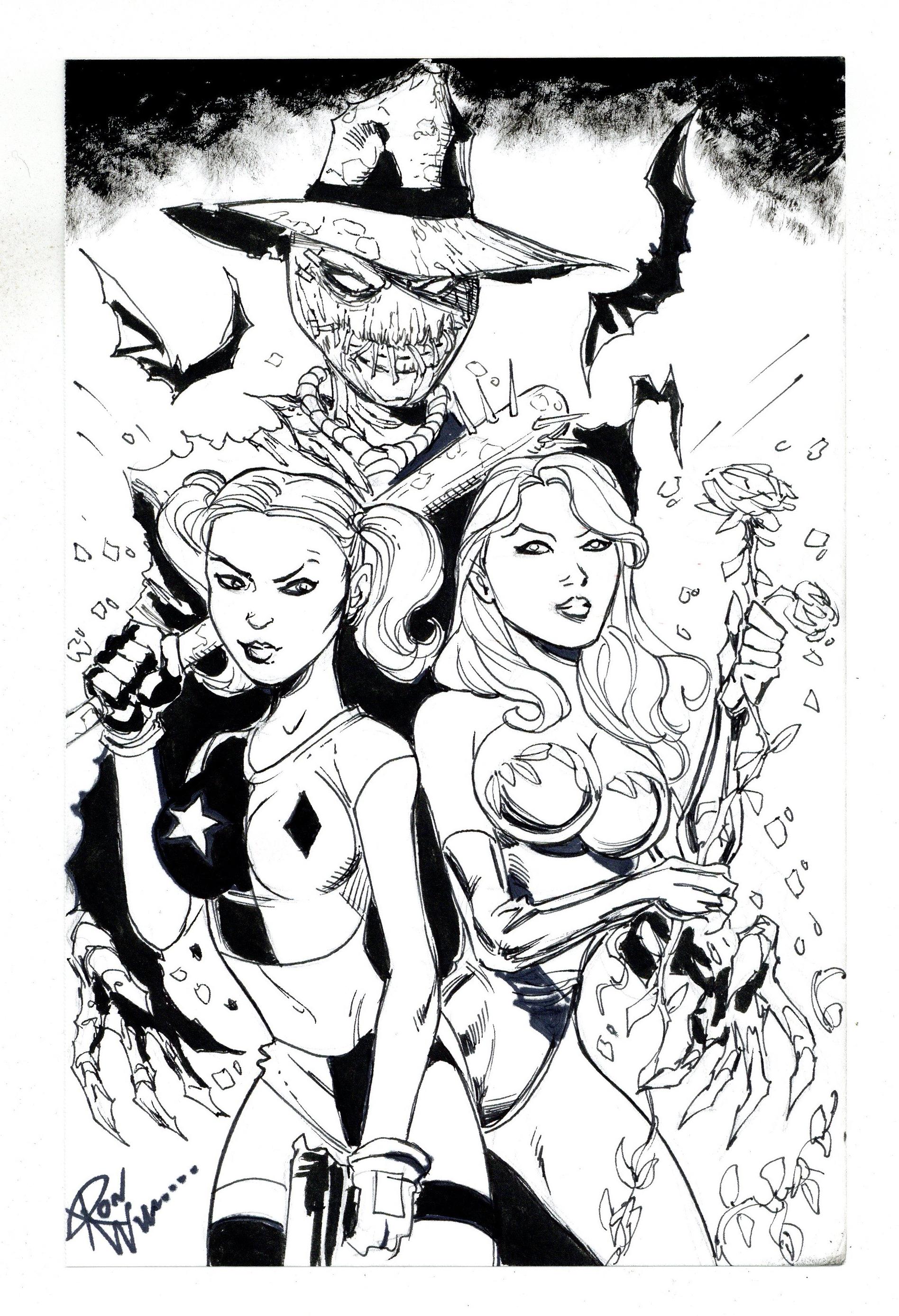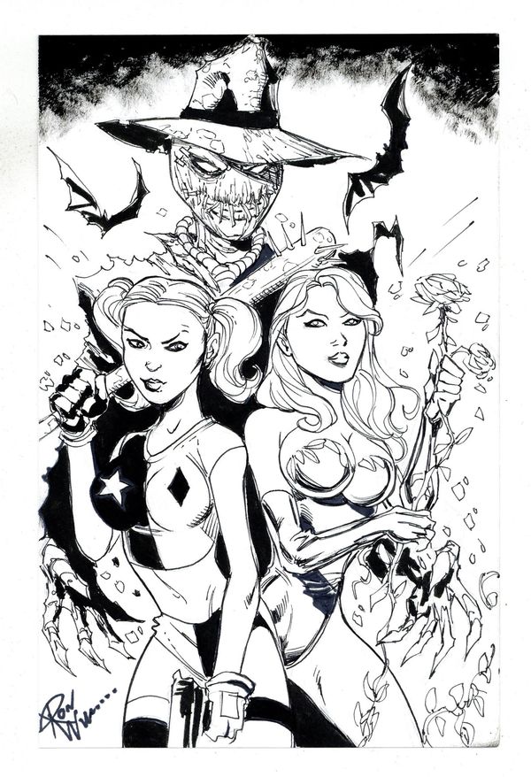 Harley Quinn, Poison Ivy, and Scarecrow Sketch by Ron Williams. Signed by the artist. Pencil and ink on heavy paper. 5 1/2" x 8 1/2", B&W.