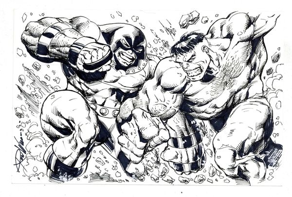 Hulk vs. Juggernaut Sketch by Ron Williams. Signed by the artist. Pencil and ink on heavy paper. 5 1/2" x 8 1/2", B&W.