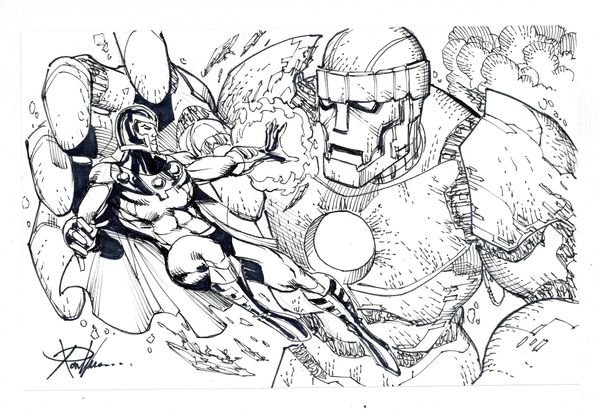 Magneto vs. Sentinel Sketch by Ron Williams. Signed by the artist. Pencil and ink on heavy paper. 5 1/2" x 8 1/2", B&W.