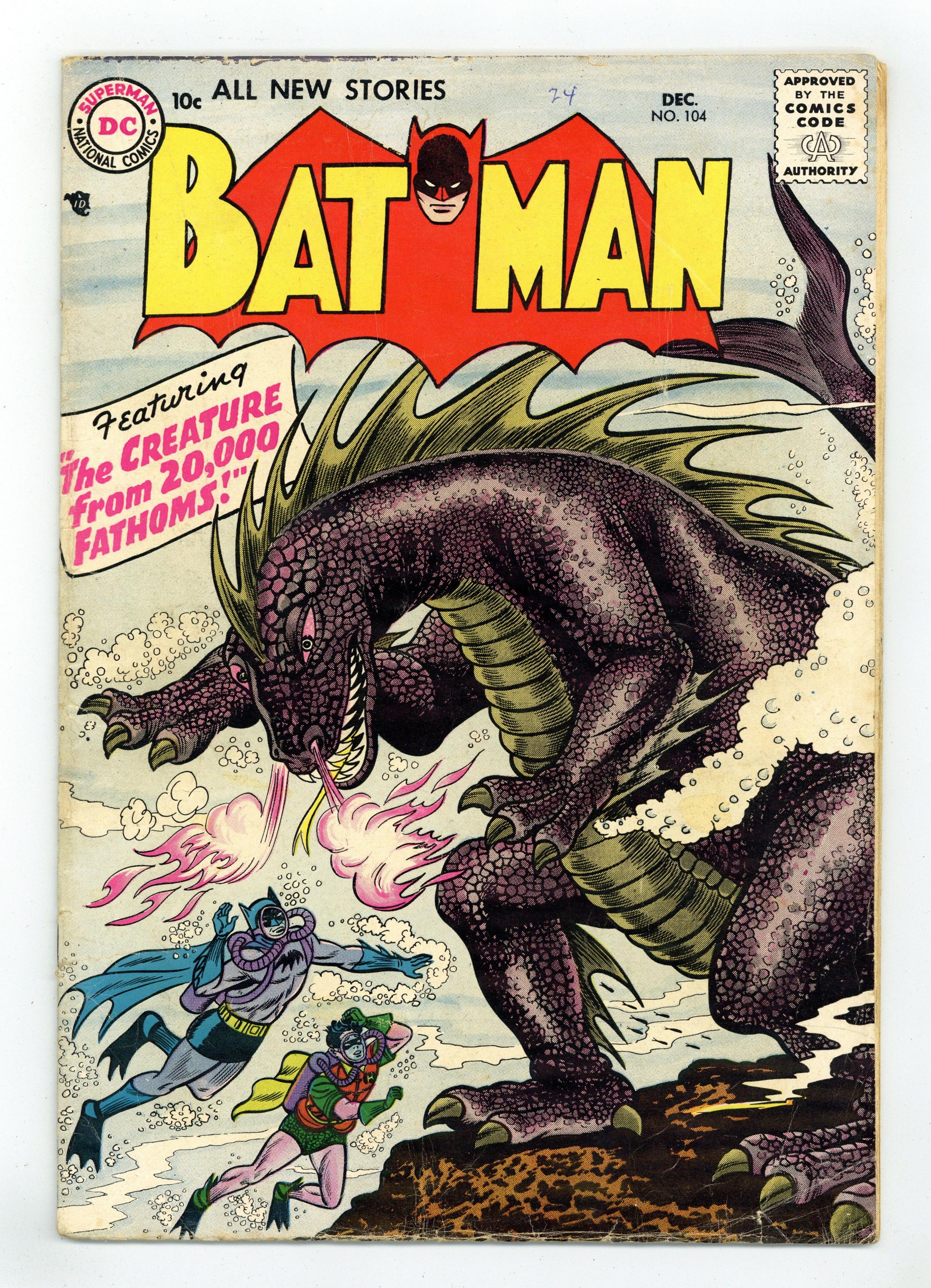 Cover by Sheldon Moldoff. "The Man Who Knew Batman's Secret," script by Edmond Hamilton, pencils by Dick Sprang, inks by Charles Paris; Batman is seeking to capture John Varden, but the wily criminal eludes him. Meanwhile, an out-of-town detective named Crane enters the picture, accidently discovering Batman's true identity, a fact well publicized by the media. Half-page Casey the Cop story by Henry Boltinoff. Gifts to the United Nations! public service announcement, art by Ruben Moreira. "Robin's 50 Batman Partners," script by Bill Finger, pencils by Dick Sprang, inks by Charles Paris; Batman injures his foot, so Robin must fill in for the Caped Crusader at the Batman Exposition, where he is being honored; Unfortunately, the Boy Wonder is attacked there by a mob who seek the diamonds the boy is carrying. 2/3-page Casey the Cop story by Henry Boltinoff. Invisible Detectives article by Jack Miller. "The Creature from 20,000 Fathoms," script by Bill Finger, pencils by Sheldon Moldoff, inks by Charles Paris; A new underwater species is discovered, but a diver seeks to sabotage efforts to study it, so Batman must step in and save the creature and its egg. 36 Pages, Full Color. Cover price $0.10. Grade: FR 1.0 explanation of grade Condition: Used (collectible)