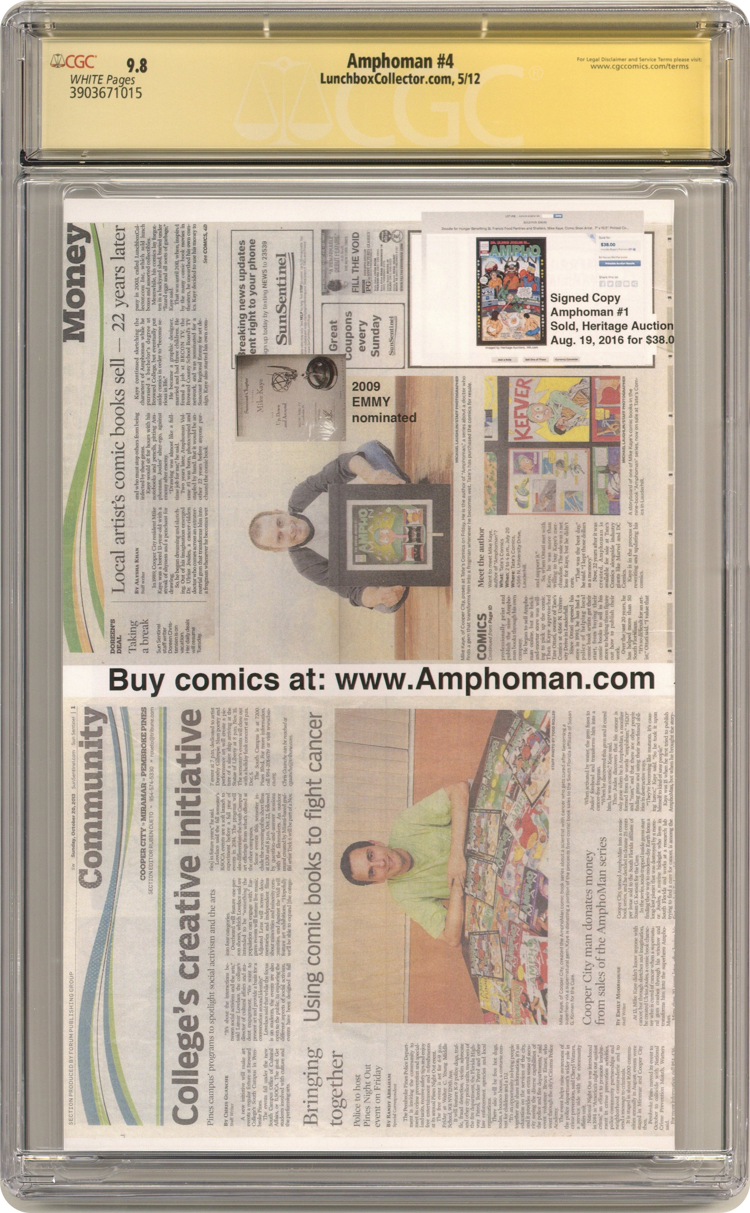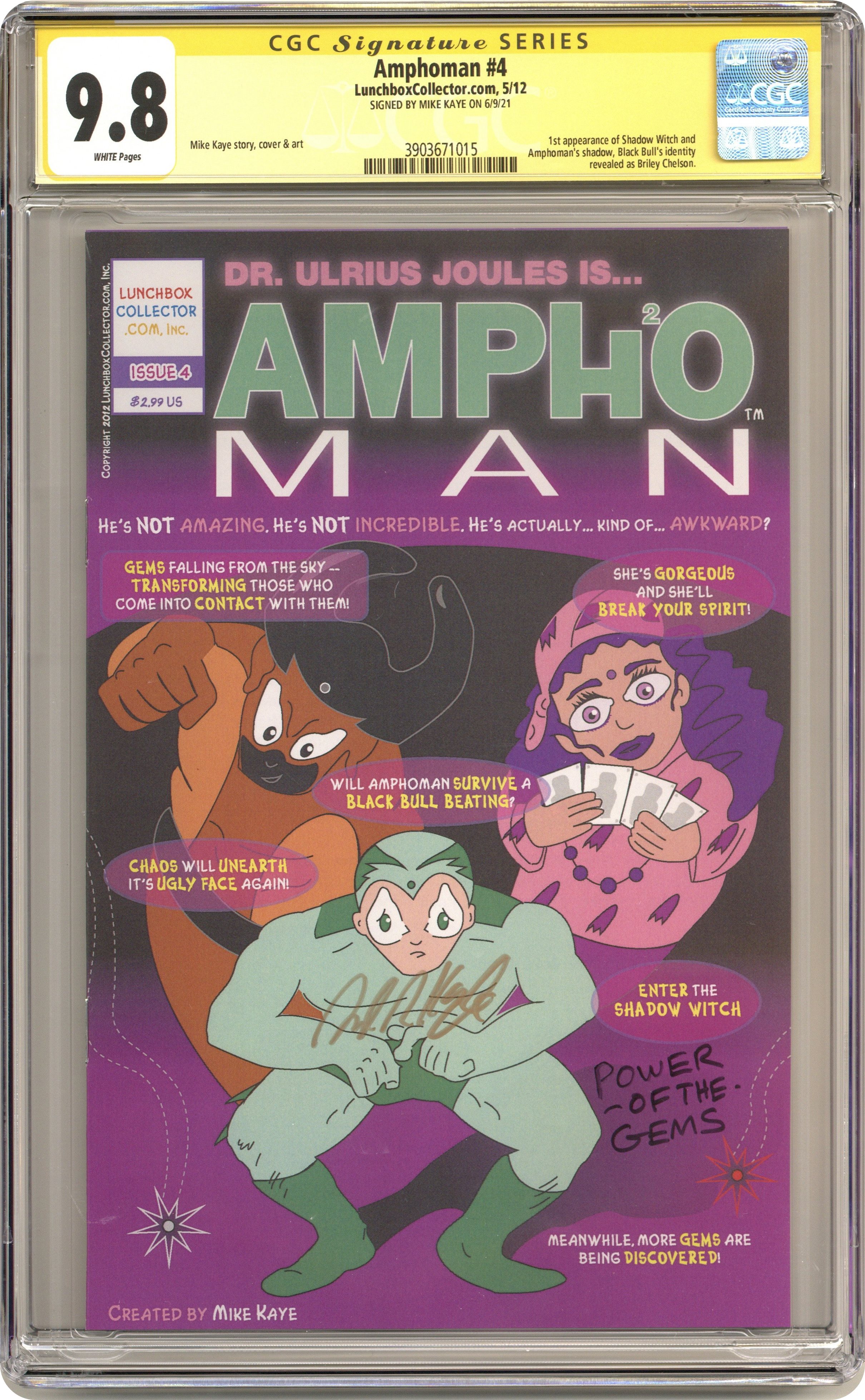 Story, art, and cover by Mike Kaye. 1st appearance of Shadow Witch and Amphoman's shadow. Black Bull's identity revealed as Briley Chelson. NOTE: Limited to 30 copies. NOTE: Many copies are signed by creator Mike Kaye. Cover price $2.99. Grade: CGC 9.8 explanation of grade Condition: Used (collectible)