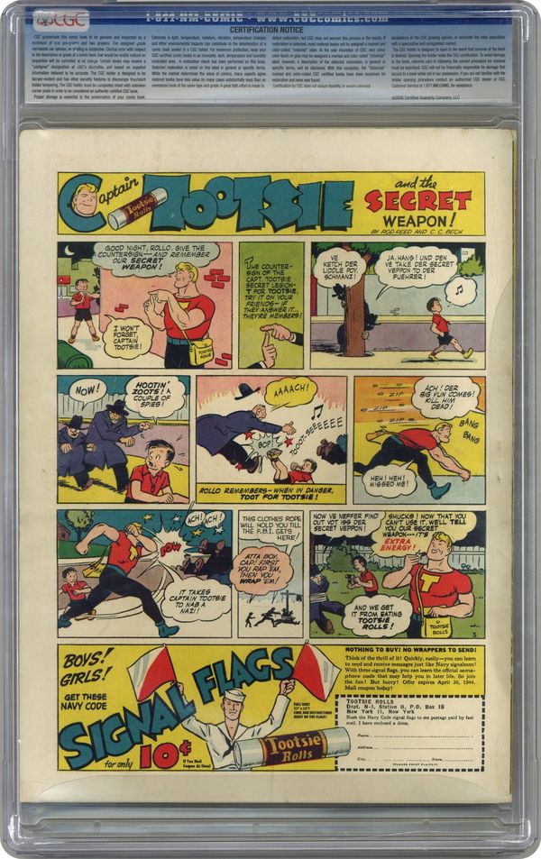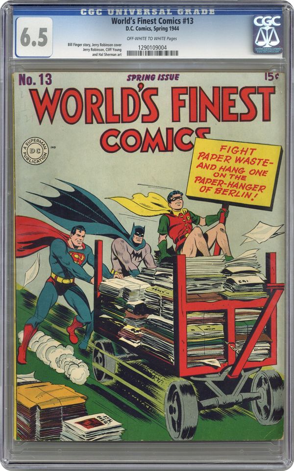 Cover art by Jack Burnley. The Freedom of the Press! starring Superman, script by Don Cameron [as Jerry Siegel], pencils by Ira Yarbrough [as Joe Shuster], inks by George Roussos [as Joe Shuster]; Lois and Clark are given the assignment to write a special story concerning the staff of the Daily Planet, but gangsters try to stop the Planet from publishing that 100th Anniversary issue. Stars of the Silver Screen starring The Star Spangled Kid and Stripesy, art by Hal Sherman. A Wreath For Sir Edgar of Wimpledown starring The Boy Commandos, script and pencils by Joe Simon, inks by Jack Kirby. Straight From The Cannon's Mouth starring Drafty, art by Stan Kaye. Paper Salvage public service announcement starring Batman and Robin, art by Jerry Robinson. Blazing Gold starring The Green Arrow, pencils by Cliff Young, inks by Steve Brodie; Crime's Most Embarrassing Moments starring Zatara, art by William F. White. The Curse of Isis! starring Batman and Robin, script by Bill Finger, pencils by Jack Burnley [as Bob Kane], inks by George Roussos [as Bob Kane] and Ray Burnley (backgrounds); A mysterious swami uses the threat of a false curse to try and obtain some rabbit's foot lucky charms from some sailors that he had secretly planted a fortune in diamonds in. 84 pages, Full Color. Cover price $0.15. Grade: CGC 6.5 explanation of grade Condition: Used (collectible)