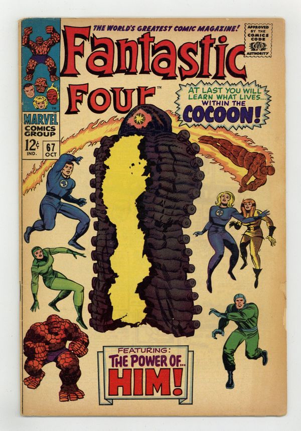 1st printing. Cover pencils by Jack Kirby, inks by Joe Sinnott. Origin (part 2) and first appearance of Him (Warlock) in "When Opens the Cocoon!", script by Stan Lee and Jack Kirby (co-plot), pencils by Jack Kirby, inks by Joe Sinnott; The FF track the kidnapped Alicia to the Beehive, where the cocoon opens and reveals Him. Crystal (of the Inhumans) appearance. 36 pgs. $0.12. NOTE: 1994 JC Penney reprint exists. Can be identified by having a Stridex ad on the back cover. Cover price $0.12. Grade: GD/VG 3.0 explanation of grade Condition: Used (collectible)