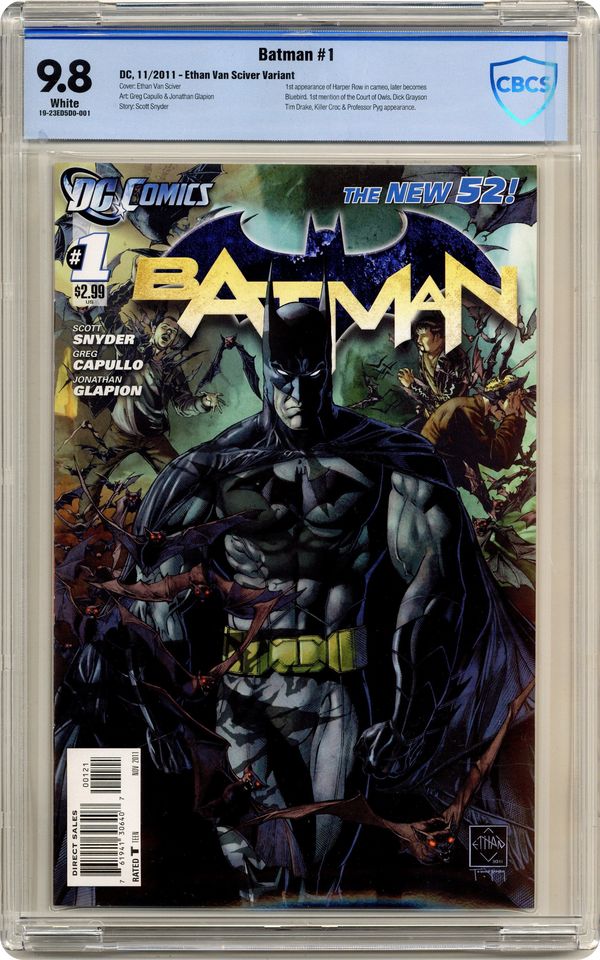 Ended Feb 14 2022 Winning Bid $99 Limited Variant cover by ETHAN VAN SCIVER Written by SCOTT SNYDER Art by GREG CAPULLO and JONATHAN GLAPION Be here for the start of a new era for The Dark Knight from writer Scott Snyder (AMERICAN VAMPIRE, BATMAN: GATES OF GOTHAM) and artist Greg Capullo (Spawn)! A series of brutal killings hints at an ancient conspiracy, and Batman learns that Gotham City is deadlier than he knew. First appearance of Harper Row (cameo, not named in issue) Cover price $2.99. Grade: CBCS 9.8 explanation of grade Condition: Used (collectible)