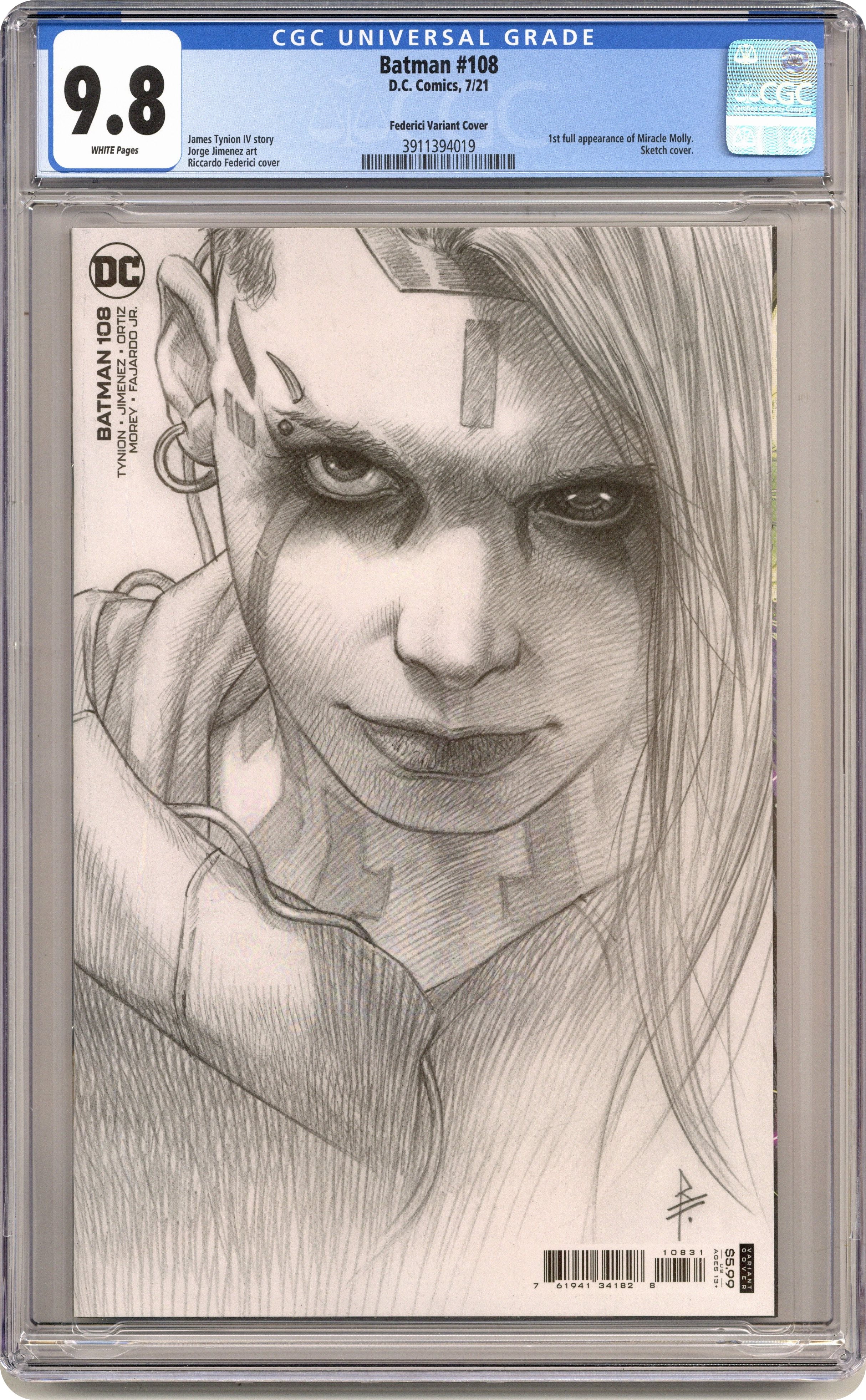 Ended May 31 2022 Winning Bid $91 Limited 1 for 25 Retailer Incentive Variant Cover. Written by James Tynion IV. Art by Jorge Jimenez, Ricardo Lopez Ortiz. Cover by Riccardo Federici. Batman goes undercover to infiltrate the transhumanist gang known as the Unsanity Collective and learn more about their sudden appearance in Gotham. And what nefarious plans does Simon Saint have for Arkham Day survivor Sean Mahoney? How does it connect to the Magistrate? And in part two of the action-packed, bone-rattling Ghost-Maker backup story...can our hero stand up to the horror of Kid Kawaii? Plus, dont miss the debut of the mysterious Miracle Molly! 40 pages, full color. Rated T+ Cover price $5.99. Grade: CGC 9.8 explanation of grade Condition: Used (collectible)