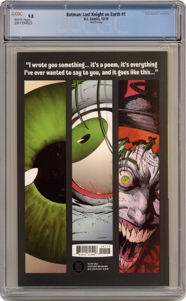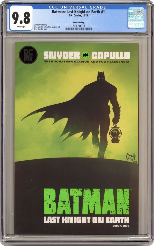 Ended May 23 2022 Winning Bid $29 3rd Printing. Written by Scott Snyder. Art by Greg Capullo and Jonathan Glapion. Cover by Greg Capullo. Bruce Wayne wakes up in Arkham Asylum. Young. Sane. And...he was never Batman. So begins this sprawling tale of the Dark Knight as he embarks on a quest through a devastated DC landscape featuring a massive cast of familiar faces from the DC Universe. As he tries to piece together the mystery of his past, he must unravel the cause of this terrible future and track down the unspeakable force that destroyed the world as he knew it… From the powerhouse creative team of writer Scott Snyder and artist Greg Capullo, the team that reinvented Batman from the emotional depths of 'Court of Owls' to the bombastic power of DARK NIGHTS: METAL, DC Black Label is proud to present the bimonthly, three-issue miniseries BATMAN: LAST KNIGHT ON EARTH, published at DC's standard comic trim size. This could be the last Batman story ever told… 52 pages, full color. Mature Readers Cover price $5.99. Grade: CGC 9.8 explanation of grade Condition: Used (collectible)