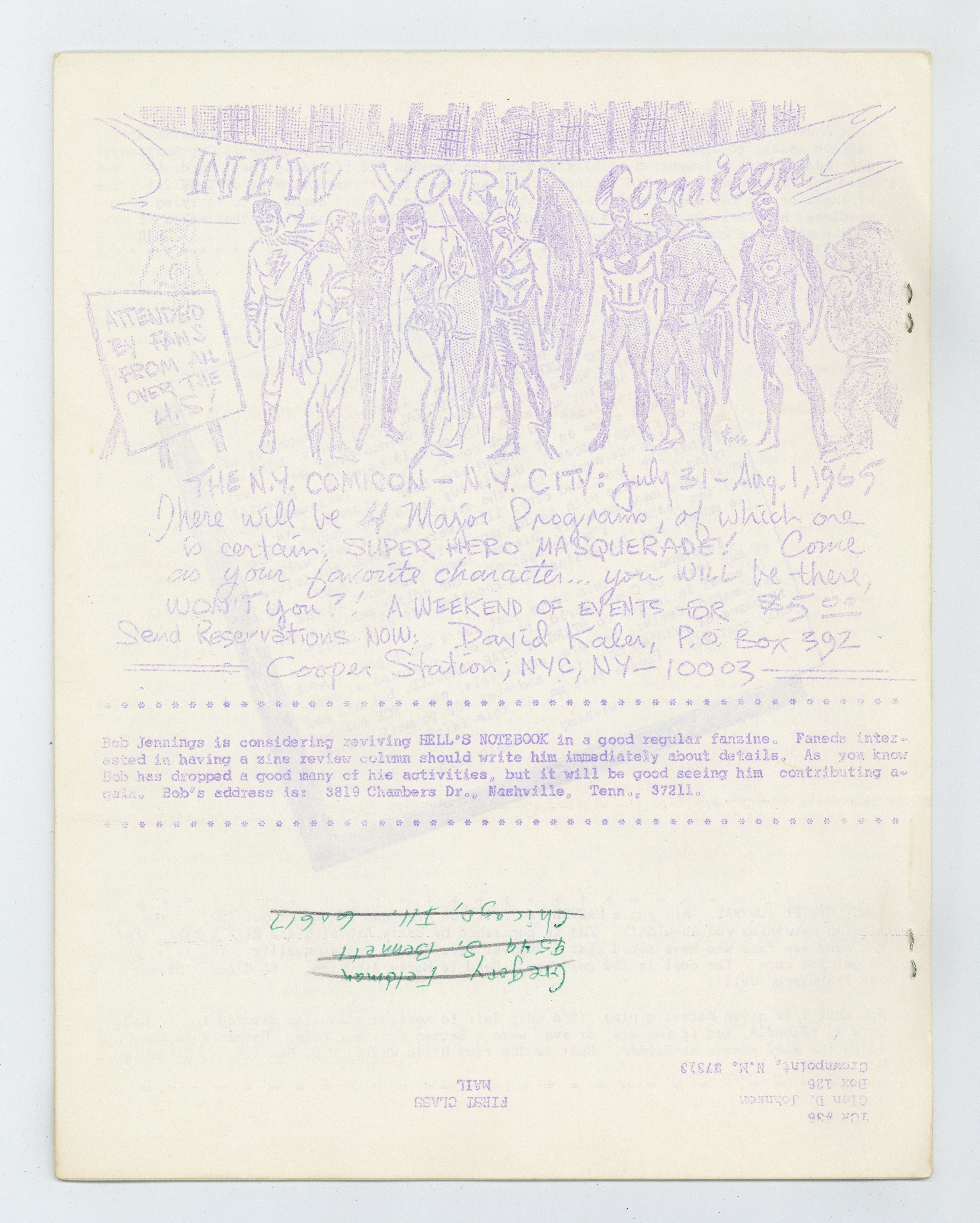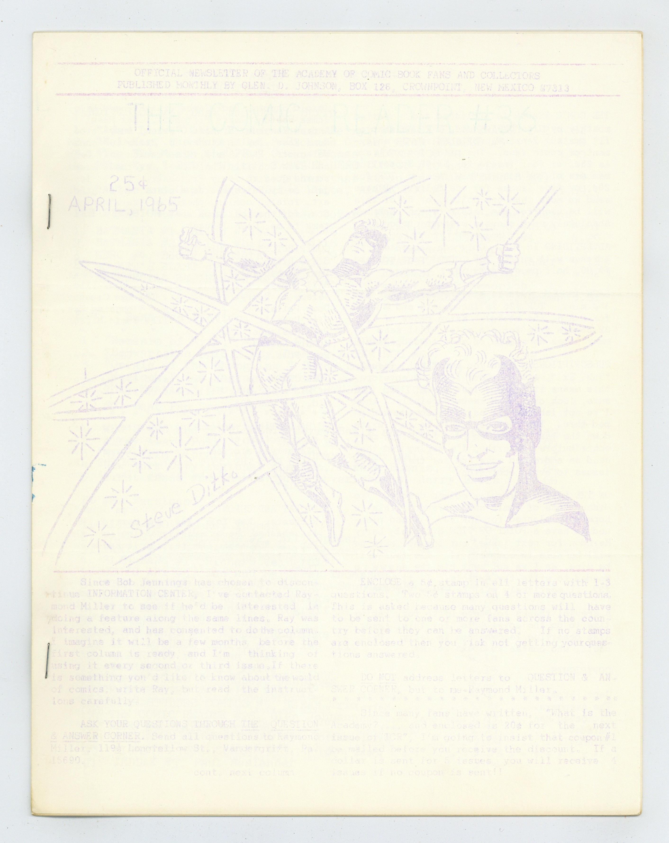 issue #36 - Apr. 1965. Art by Steve Ditko of Captain Atom. Interior art by Doug Potter, Ronn Foss, Bill Dubay, Howard Keltner and others. 1964 Alley Awards results. Academy news by Paul Gambaccini. Comic news and a short piece by Howard Rogofsky going into his recent spate of missing money sent through the mail. The Ego Crusher fanzine review column by Jeremy Barry. Letters from Ray Miller and others. The Cosmic Mirror by Rick Durell and Paul Moslander compares Marvel's Daredevil and Charles Biro's Daredevil. Ad for the NYC Comicon taking place July 31-Aug. 1, 1965. 8 1/2-in. x 11-in., 20 pages, B&W. Cover price $0.25. Grade: VF+ 8.5 explanation of grade Condition: Used (collectible)