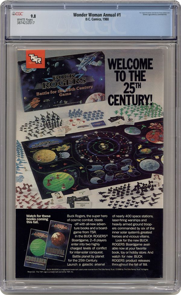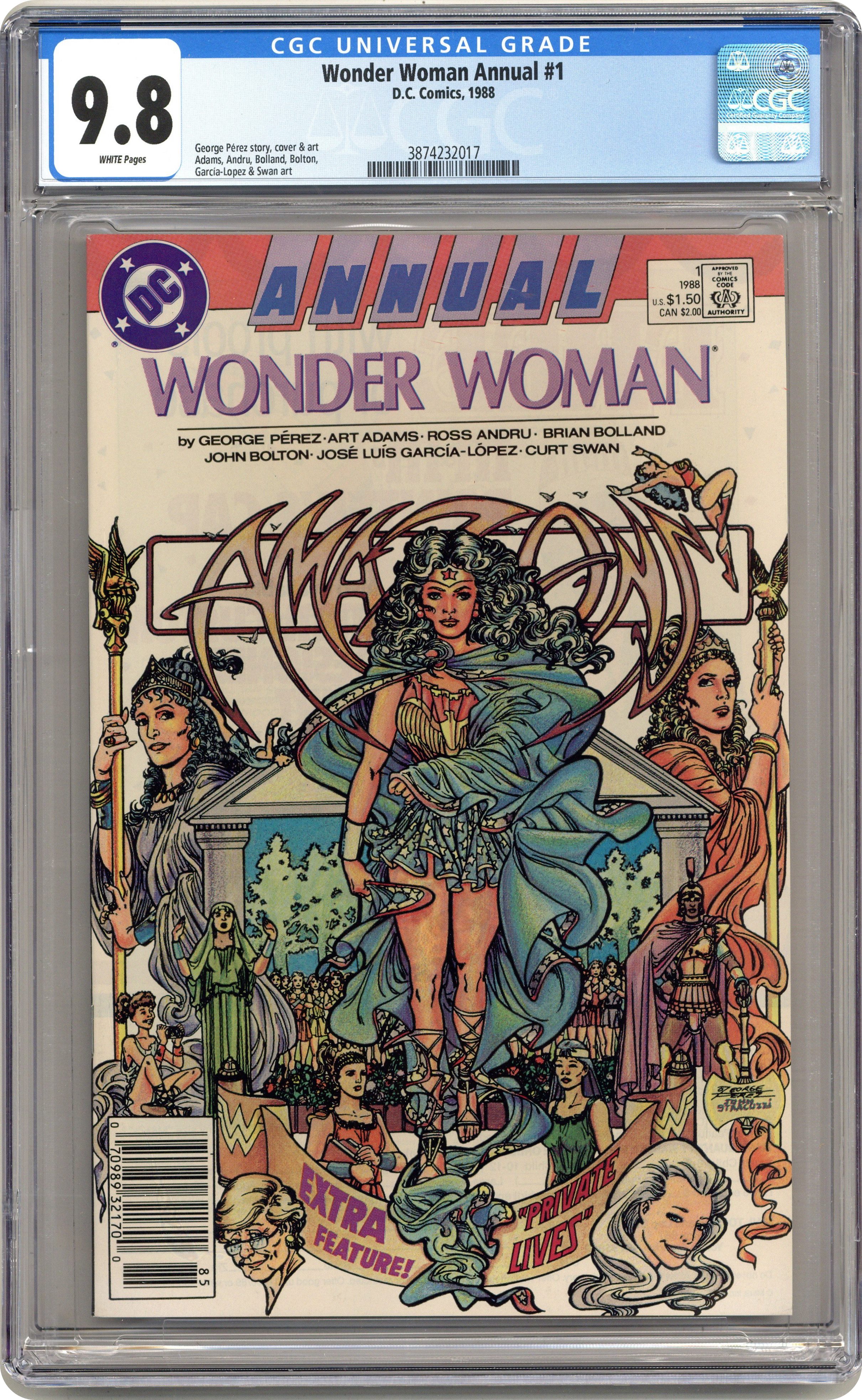 Amazons are spotlighted as Diana takes Julia and Vanessa on a trip to the island paradise of Themyscira in "Amazons." Script by George Perez, art by Brian Bolland & Mark Farmer (2 pages), Chris Marrinan & Willie Blyberg (3 pages), Art Adams (6 pages), John Bolton (6 pages), Jose Luis Garcia-Lopez (6 pages), Curt Swan & Bob McLeod (6 pages), Ross Andru & Perez (7 pages). Plus: Diana attends the reading of Myndi Mayer's will in the 5-page 'Private Lives' tale "Testament," written & drawn by Perez. Cover by Perez. 52 pgs. Cover price $1.50. Grade: CGC 9.8 explanation of grade Condition: Used (collectible)