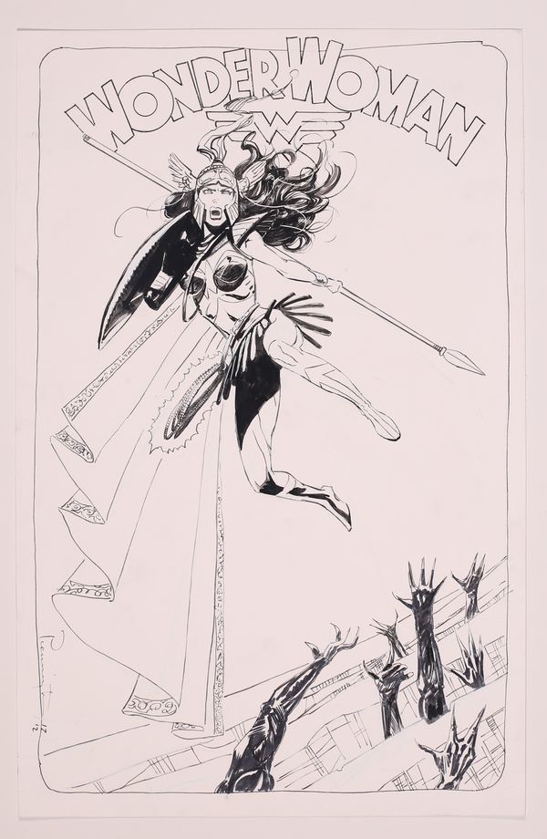Wonder Woman Sketch by Mark Pennington. SIgned by the artist. Blue line pencil and ink on Bristol board. 11" x 17", B&W.