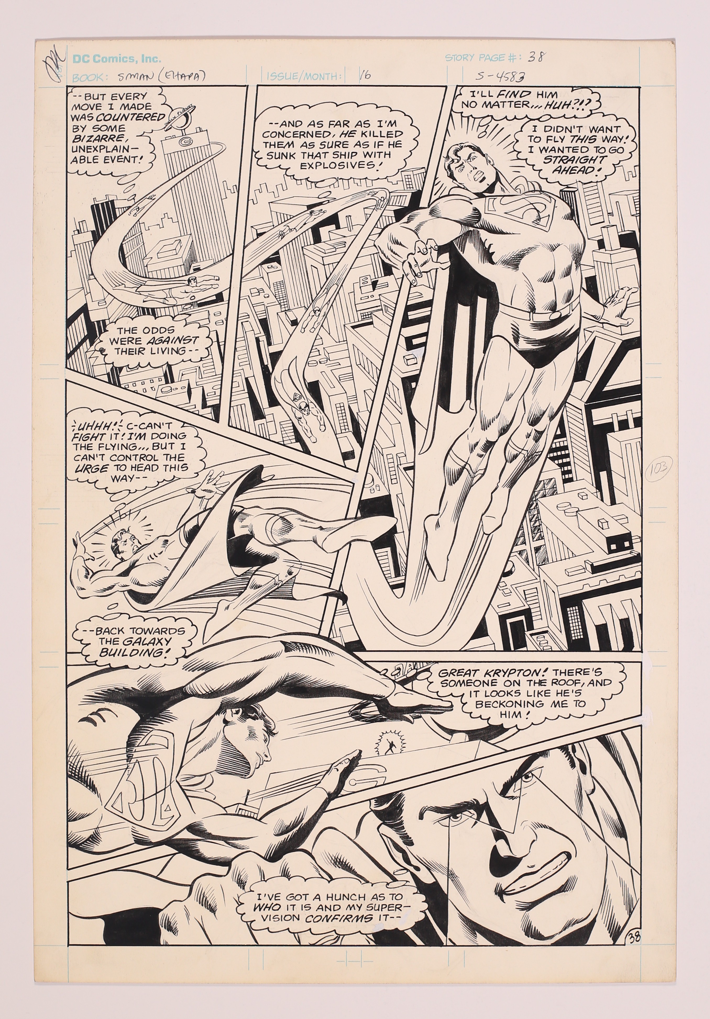 Original Art for Superman Taschenbuch (German Series 1976) Issue 78, Page 38 by Alex Saviuk and Pablo Marcos. Pencil and ink on DC Comics Bristol board. 11 1/4" x 16 1/2", B&W. Note about this story from Grand Comics Database: The story is not a US original reprint because it was created exclusively for the German market and is listed under the name "Superman Quarterly" #16 "The Luckiest Man in the World".