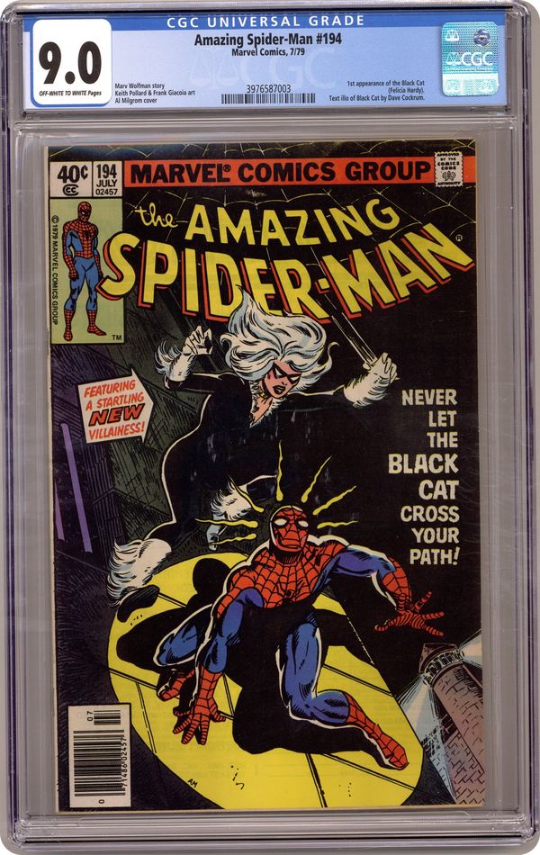 Ended May 23 2022 Winning Bid $681 Newsstand Edition. First appearance of the Black Cat in "Never Let The Black Cat Cross Your Path!" Part 1 of 2. Script by Marv Wolfman. Art by Keith Pollard (breakdowns) and Frank Giacoia (finishes). Cover by Al Milgrom. One of the landmark issues of the Amazing Spider-Man series! The dazzling debut of the Black Cat! The wall-crawler has spent the first 193 issues of his title chasing super-villains! But tonight he's going to kiss one instead! Wow! Does the web-slinger stand a chance against the beauty and charm of Felicia Hardy? Not when the alluring cat has his tongue! And maybe later his heart! A terrific issue! Cameo appearances by Aunt May, Betty Brant, Ned Leeds, Harry Osborn, Flash Thompson, Mysterio (in civilian clothes), and the burglar. (Notes: The Black Cat is the creative highlight of the Wolfman-Pollard run on the Amazing Spider-Man title. Dave Cockrum designed the cat's costume. The letters page includes an alternate cover (for issue 194) by Keith Pollard. It also includes an alternate cover to Spider-Woman 9 by Carmine Infantino. This two-part story was reprinted in the trade paperback: Spider-Man vs. the Black Cat (2005). 36 pages, full color. Cover price $0.40. Grade: CGC 9.0 explanation of grade Condition: Used (collectible)