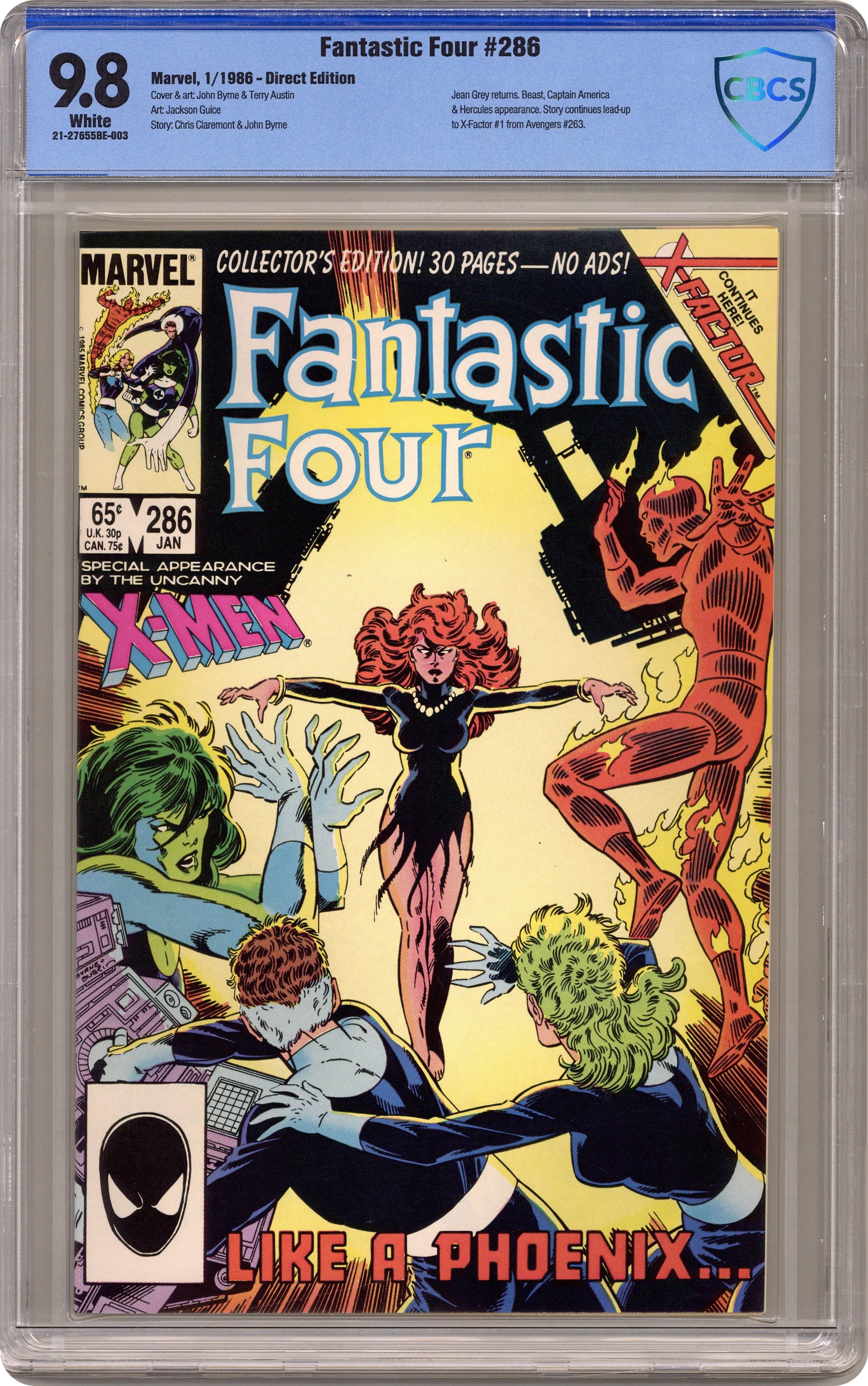 Ended Jan 21 2024 Winning Bid $45 Direct Edition. Last 65-cent issue. Return of Jean Grey: Part 2 of 3 - X-Factor tie-in. "Like a Phoenix!" Guest-starring the Uncanny X-Men and Avengers. Story by John Byrne. Art by John Byrne and Terry Austin. Cover by John Byrne. Story continued from Avengers (Vol. 1) #263. Don't miss the startling return of Jean Grey! How did she survive, and where has she been? The answers will shock and surprise you. Plus, this issue sets the stage for the return of the of the original X-Men! Story continues in X-Factor (1986-1998 1st Series) #1. 36 pgs. Cover price $0.65. Grade: CBCS 9.8 explanation of grade Condition: Used (collectible)