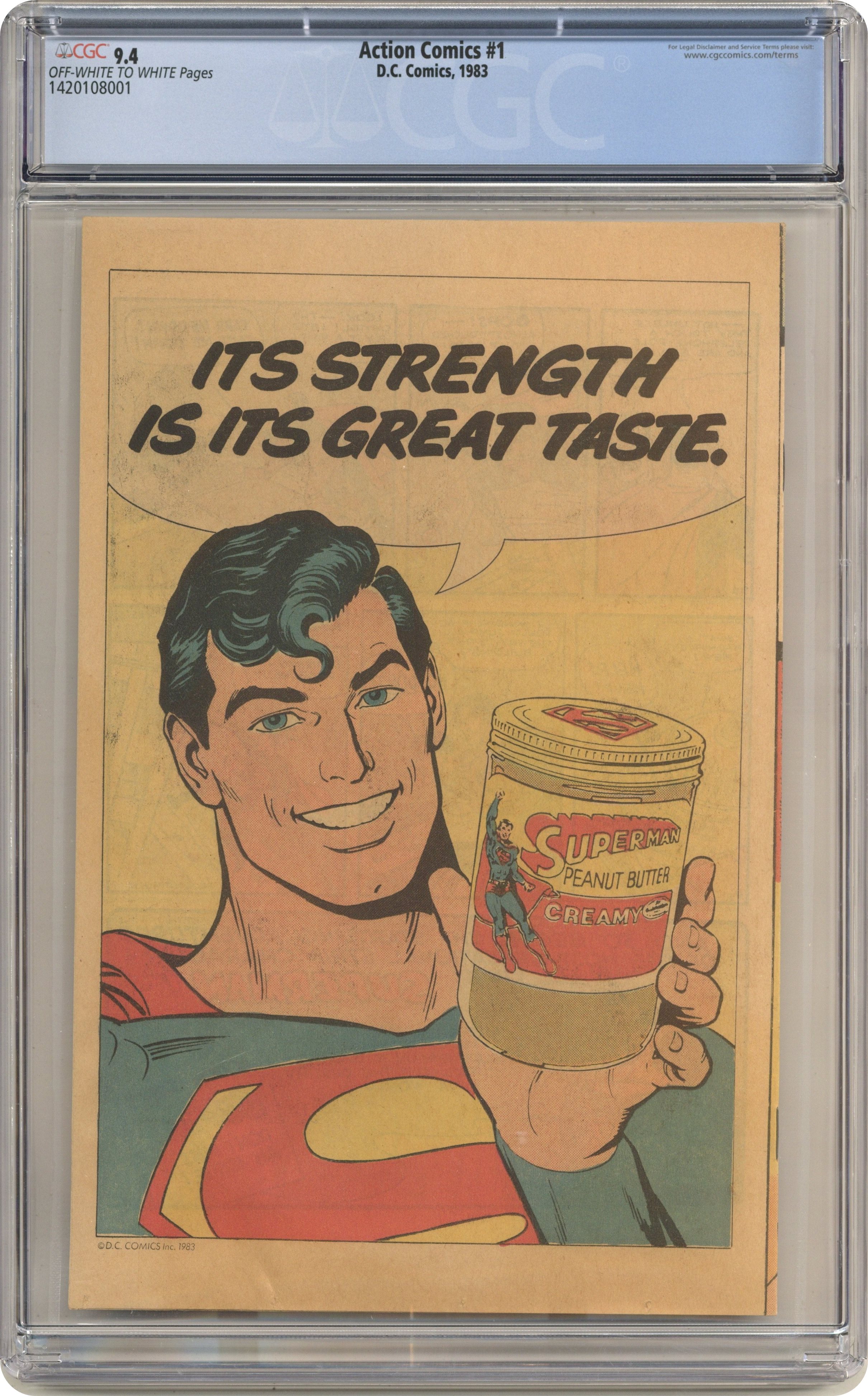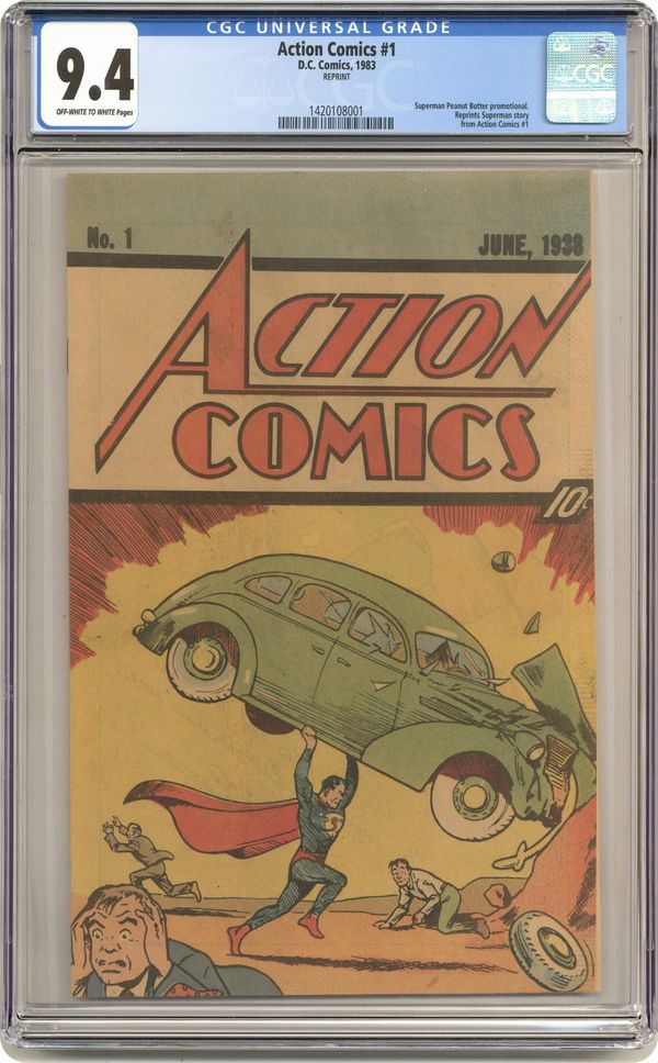 Reprint of Action #1. 1983 Superman Peanut Butter reprint. Superman Peanut Butter ad on back cover. Cover price $0.50. Grade: CGC 9.4 explanation of grade Condition: Used (collectible)