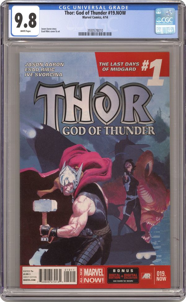 Cover by Esad Ribic - The Last Days of Midgard: Part 1 of 5 - Written by Jason Aaron. Art by Esad Ribic. THE LAST DAYS OF MIDGARD begin NOW! Thor, Asgardian God of Thunder, has always fought to save his adopted home of Earth. But who can he fight when the planet itself is dying? Thor's mortal ally and environmental secret agent Roz Solomon has a few ideas. Namely the world's largest and most nefarious energy company Roxxon, and its ruthless new CEO known as 'The Minotaur.' Has the God of Thunder finally met his match, in the form of a multinational super-corporation? Meanwhile, many millennia ahead, a future version of Thor faces a very different battle to save what remains of the earth--a battle against the greatest villain the Marvel Universe has ever known-Galactus, the Devourer of Worlds! Cover price $3.99. Grade: CGC 9.8 explanation of grade Condition: Used (collectible)