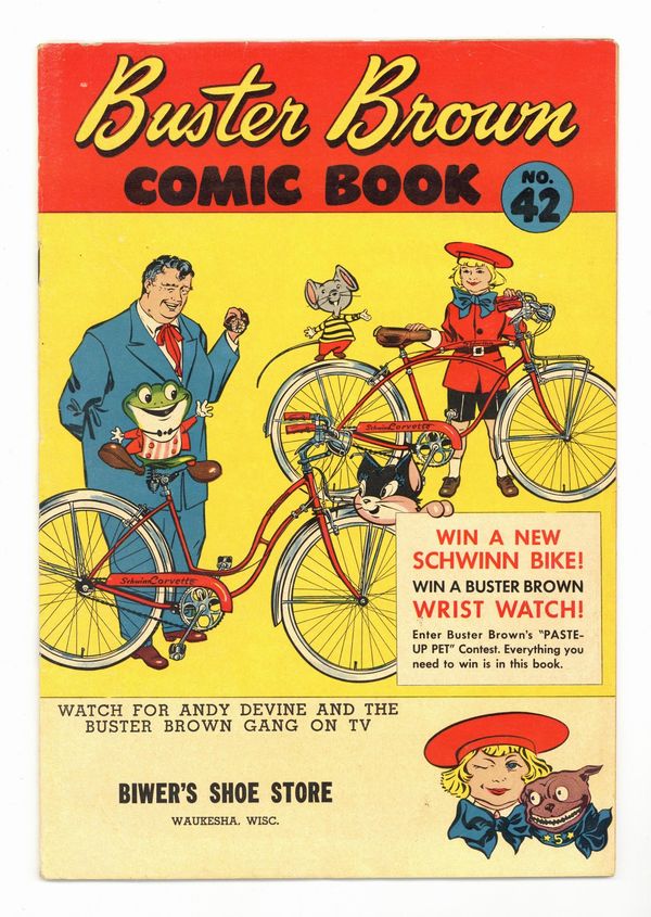 Stories by Michael Gerbosi. Art by Ray Willner and others. A classic giveaway comic from the Brown shoe company, featuring adventure stories and comical hijinks from Andy Devine and the Buster Brown Gang of talking animals. Gunga the elephant boy tracks a rogue elephant; Froggy Gremlin shrinks Andy down so he can ride in a toy plane with the rest of the gang; A dog undertakes an epic journey to return to the disabled girl who owns him. The Capture of Teela; Andy and the Gang Take to the Air; Puddles and a World of Legs. 32 pages, Full Color. Grade: VG 4.0 explanation of grade Condition: Used (collectible)